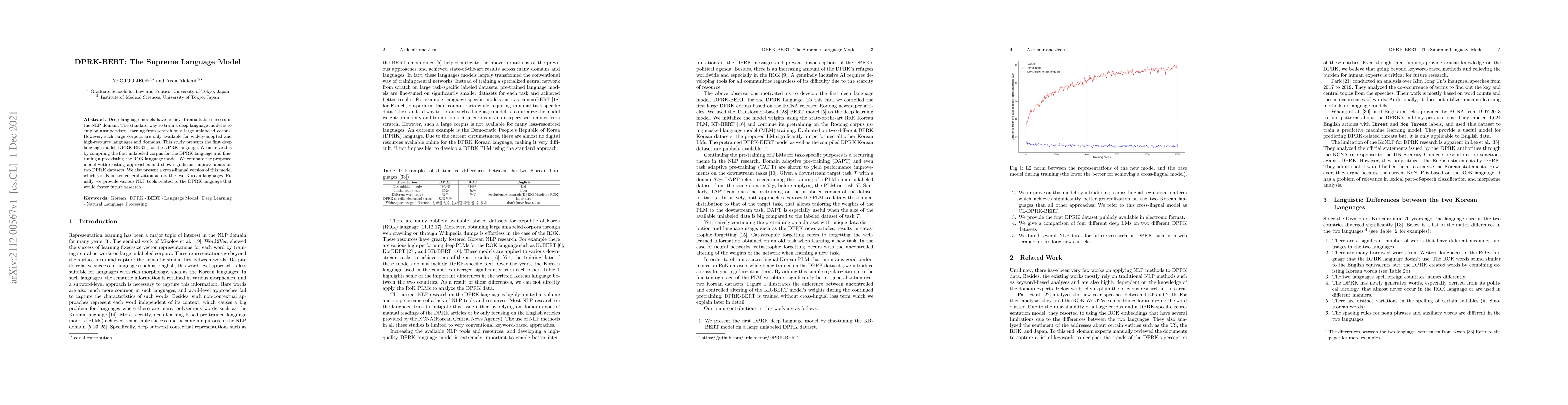 Deep language models have achieved remarkable success in the NLP domain. The standard way to train a deep language model is to employ unsupervised learning from scratch on a large unlabeled corpus. However, such large corpora are only available for widely-adopted and high-resource languages and domains. This study presents the first deep language model, DPRK-BERT, for the DPRK language. We achieve this by compiling the first unlabeled corpus for the DPRK language and fine-tuning a preexisting the ROK language model. We compare the proposed model with existing approaches and show significant improvements on two DPRK datasets. We also present a cross-lingual version of this model which yields better generalization across the two Korean languages. Finally, we provide various NLP tools related to the DPRK language that would foster future research.