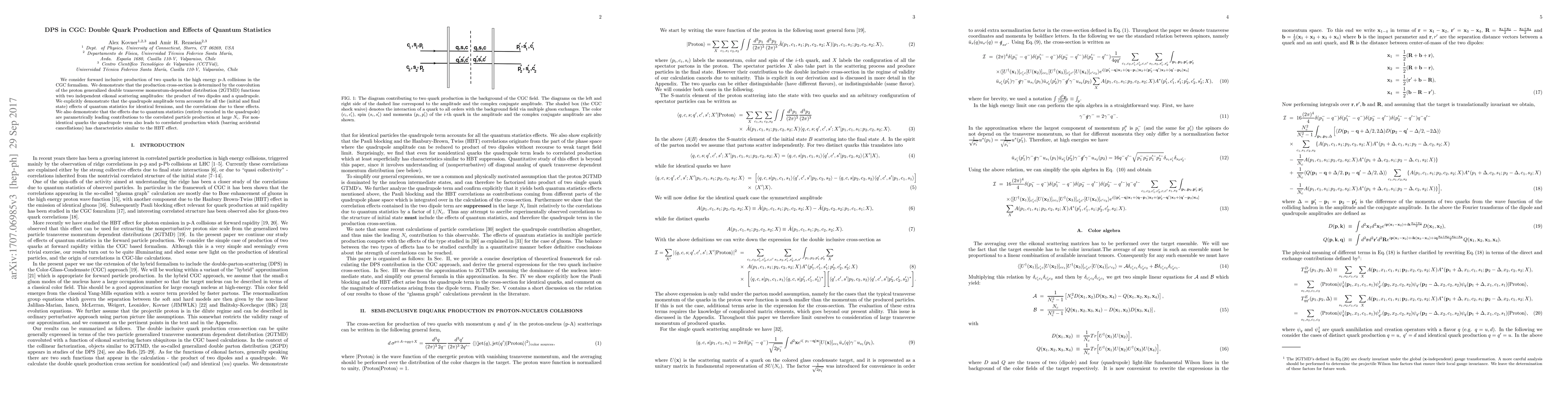 We consider forward inclusive production of two quarks in the high energy p-A collisions in the CGC formalism. We demonstrate that the production cross-section is determined by the convolution of the proton generalized double transverse momentum-dependent distribution (2GTMD) functions with two independent eikonal scattering amplitudes: the product of two dipoles and a quadrupole. We explicitly demonstrate that the quadrupole amplitude term accounts for all the (initial and final state) effects of quantum statistics for identical fermions, and the correlations due to these effects. We also demonstrate that the effects due to quantum statistics (entirely encoded in the quadrupole) are parametrically leading contributions to the correlated particle production at large $N_c$. For non-identical quarks the quadrupole term also leads to correlated production which has characteristics similar to the HBT effect.