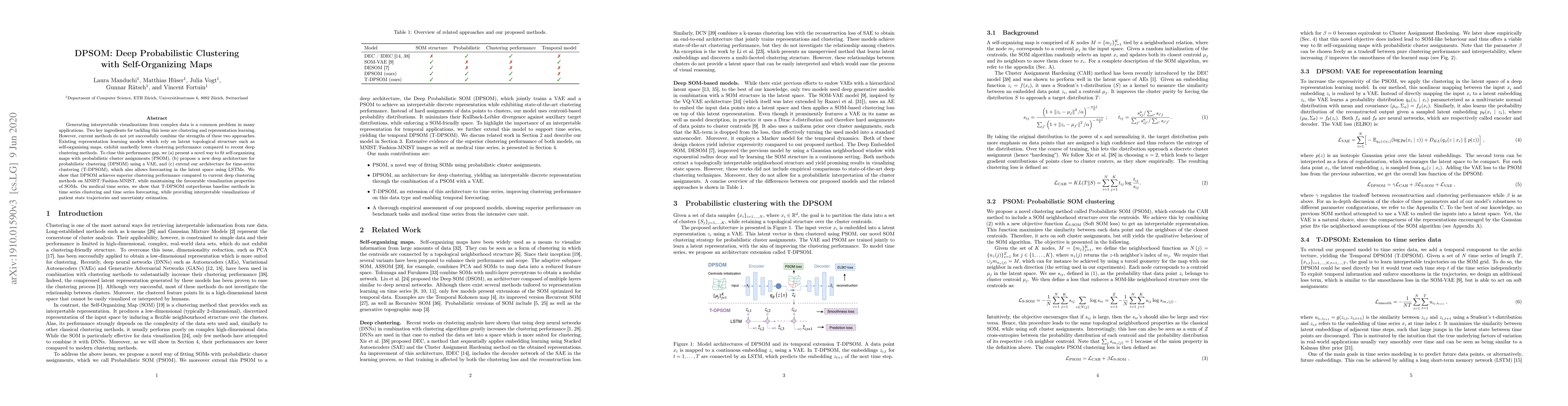 Generating interpretable visualizations from complex data is a common problem in many applications. Two key ingredients for tackling this issue are clustering and representation learning. However, current methods do not yet successfully combine the strengths of these two approaches. Existing representation learning models which rely on latent topological structure such as self-organising maps, exhibit markedly lower clustering performance compared to recent deep clustering methods. To close this performance gap, we (a) present a novel way to fit self-organizing maps with probabilistic cluster assignments (PSOM), (b) propose a new deep architecture for probabilistic clustering (DPSOM) using a VAE, and (c) extend our architecture for time-series clustering (T-DPSOM), which also allows forecasting in the latent space using LSTMs. We show that DPSOM achieves superior clustering performance compared to current deep clustering methods on MNIST/Fashion-MNIST, while maintaining the favourable visualization properties of SOMs. On medical time series, we show that T-DPSOM outperforms baseline methods in time series clustering and time series forecasting, while providing interpretable visualizations of patient state trajectories and uncertainty estimation.