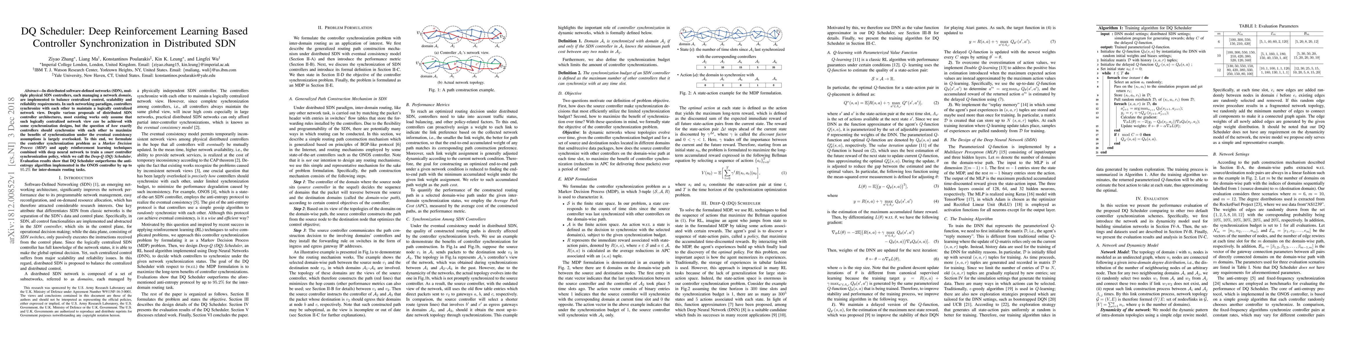 This paper proposes a Deep-Q (DQ) Scheduler, a reinforcement learning-based controller synchronization policy for distributed SDN, formulated as a Markov Decision Process (MDP). The DQ Scheduler outperforms traditional synchronization methods, notably improving inter-domain routing tasks by up to 95.2%.