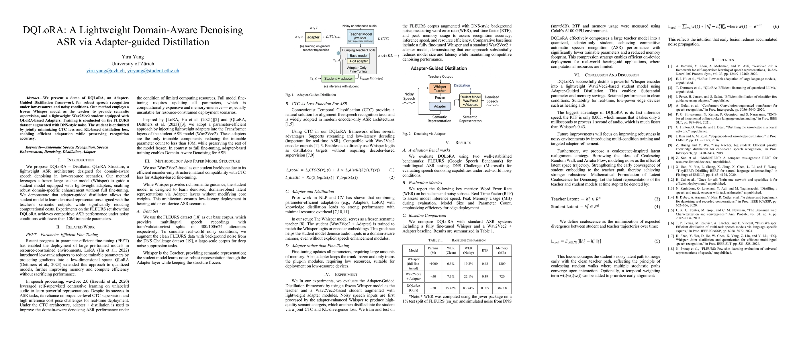 We present a demo of DQLoRA, an Adapter-Guided Distillation framework for robust speech recognition under low-resource and noisy conditions. Our method employs a frozen Whisper model as the teacher to provide semantic supervision, and a lightweight Wav2Vec2 student equipped with QLoRA-based Adapters. Training is conducted on the FLEURS dataset augmented with DNS-style noise. The student is optimized by jointly minimizing CTC loss and KL-based distillation loss, enabling efficient adaptation while preserving recognition accuracy.