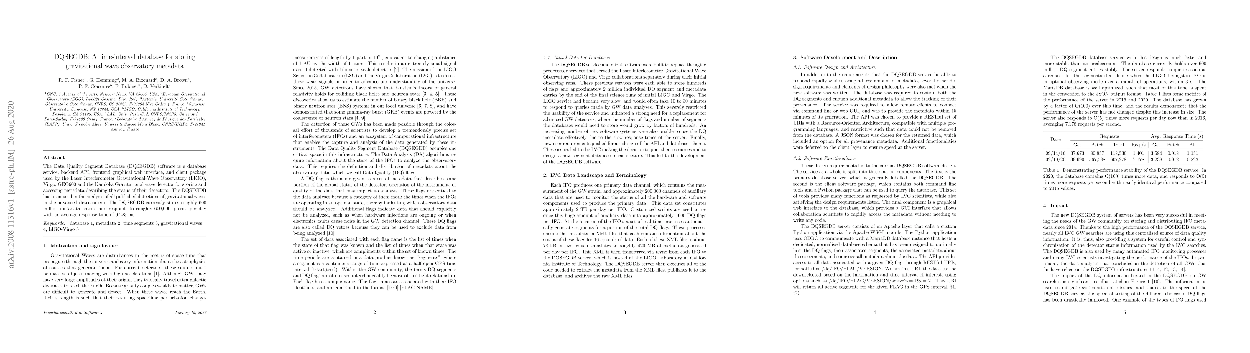 The Data Quality Segment Database (DQSEGDB) software is a database service, backend API, frontend graphical web interface, and client package used by the Laser Interferometer Gravitational-Wave Observatory (LIGO), Virgo, GEO600 and the Kamioka Gravitational wave detector for storing and accessing metadata describing the status of their detectors. The DQSEGDB has been used in the analysis of all published detections of gravitational waves in the advanced detector era. The DQSEGDB currently stores roughly 600 million metadata entries and responds to roughly 600,000 queries per day with an average response time of 0.223 ms.