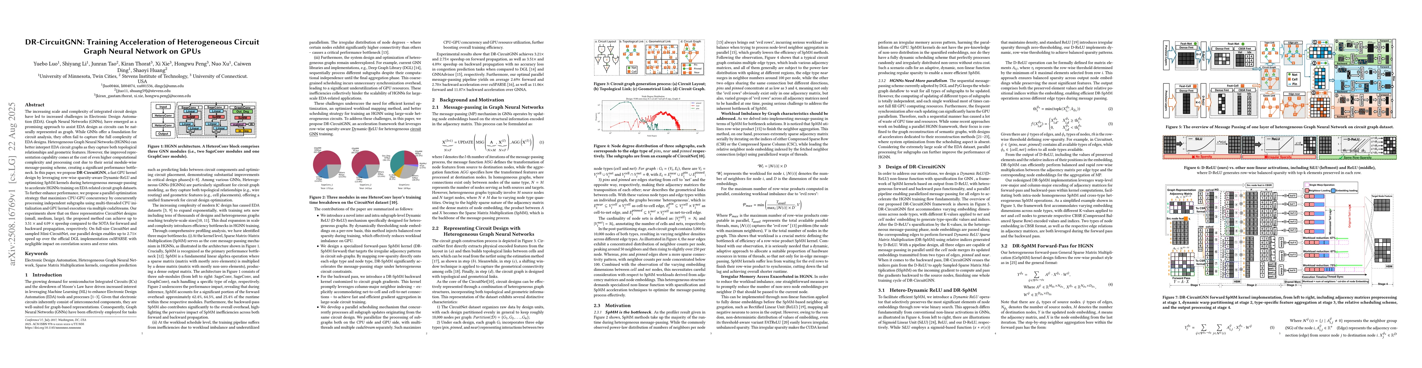 The increasing scale and complexity of integrated circuit design have led to increased challenges in Electronic Design Automation (EDA). Graph Neural Networks (GNNs) have emerged as a promising approach to assist EDA design as circuits can be naturally represented as graphs. While GNNs offer a foundation for circuit analysis, they often fail to capture the full complexity of EDA designs. Heterogeneous Graph Neural Networks (HGNNs) can better interpret EDA circuit graphs as they capture both topological relationships and geometric features. However, the improved representation capability comes at the cost of even higher computational complexity and processing cost due to their serial module-wise message-passing scheme, creating a significant performance bottleneck. In this paper, we propose DR-CircuitGNN, a fast GPU kernel design by leveraging row-wise sparsity-aware Dynamic-ReLU and optimizing SpMM kernels during heterogeneous message-passing to accelerate HGNNs training on EDA-related circuit graph datasets. To further enhance performance, we propose a parallel optimization strategy that maximizes CPU-GPU concurrency by concurrently processing independent subgraphs using multi-threaded CPU initialization and GPU kernel execution via multiple cudaStreams. Our experiments show that on three representative CircuitNet designs (small, medium, large), the proposed method can achieve up to 3.51x and 4.09x speedup compared to the SOTA for forward and backward propagation, respectively. On full-size CircuitNet and sampled Mini-CircuitNet, our parallel design enables up to 2.71x speed up over the official DGL implementation cuSPARSE with negligible impact on correlation scores and error rates.