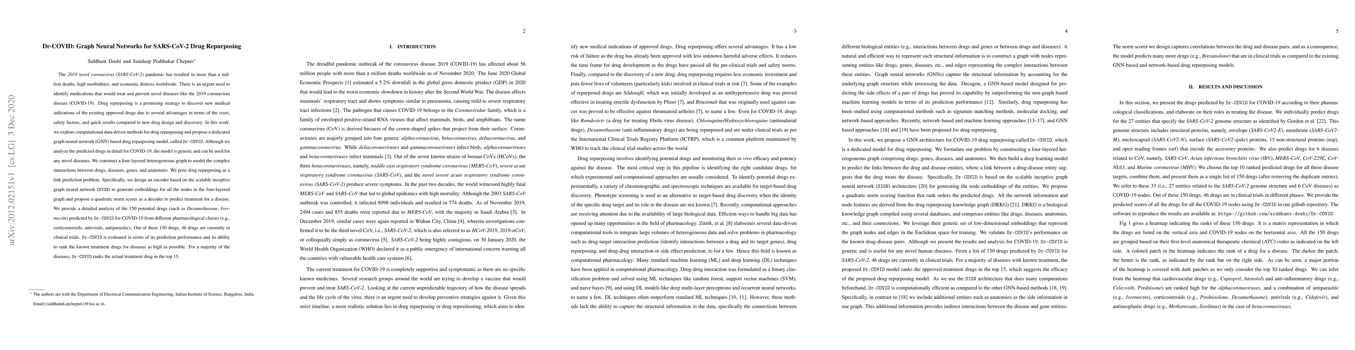 The 2019 novel coronavirus (SARS-CoV-2) pandemic has resulted in more than a million deaths, high morbidities, and economic distress worldwide. There is an urgent need to identify medications that would treat and prevent novel diseases like the 2019 coronavirus disease (COVID-19). Drug repurposing is a promising strategy to discover new medical indications of the existing approved drugs due to several advantages in terms of the costs, safety factors, and quick results compared to new drug design and discovery. In this work, we explore computational data-driven methods for drug repurposing and propose a dedicated graph neural network (GNN) based drug repurposing model, called Dr-COVID. Although we analyze the predicted drugs in detail for COVID-19, the model is generic and can be used for any novel diseases. We construct a four-layered heterogeneous graph to model the complex interactions between drugs, diseases, genes, and anatomies. We pose drug repurposing as a link prediction problem. Specifically, we design an encoder based on the scalable inceptive graph neural network (SIGN) to generate embeddings for all the nodes in the four-layered graph and propose a quadratic norm scorer as a decoder to predict treatment for a disease. We provide a detailed analysis of the 150 potential drugs (such as Dexamethasone, Ivermectin) predicted by Dr-COVID for COVID-19 from different pharmacological classes (e.g., corticosteroids, antivirals, antiparasitic). Out of these 150 drugs, 46 drugs are currently in clinical trials. Dr-COVID is evaluated in terms of its prediction performance and its ability to rank the known treatment drugs for diseases as high as possible. For a majority of the diseases, Dr-COVID ranks the actual treatment drug in the top 15.