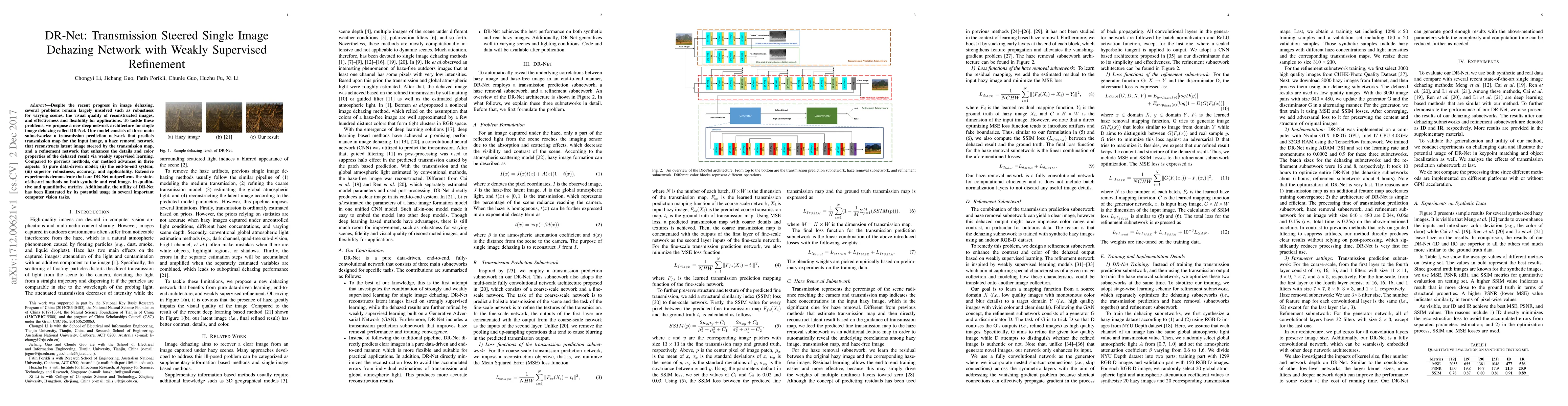 DR-Net is a novel deep network architecture for single image dehazing that includes a transmission prediction network, a haze removal network, and a refinement network for enhanced details. The method demonstrates superior robustness, accuracy, and applicability compared to previous techniques, outperforming state-of-the-art methods in both qualitative and quantitative metrics.