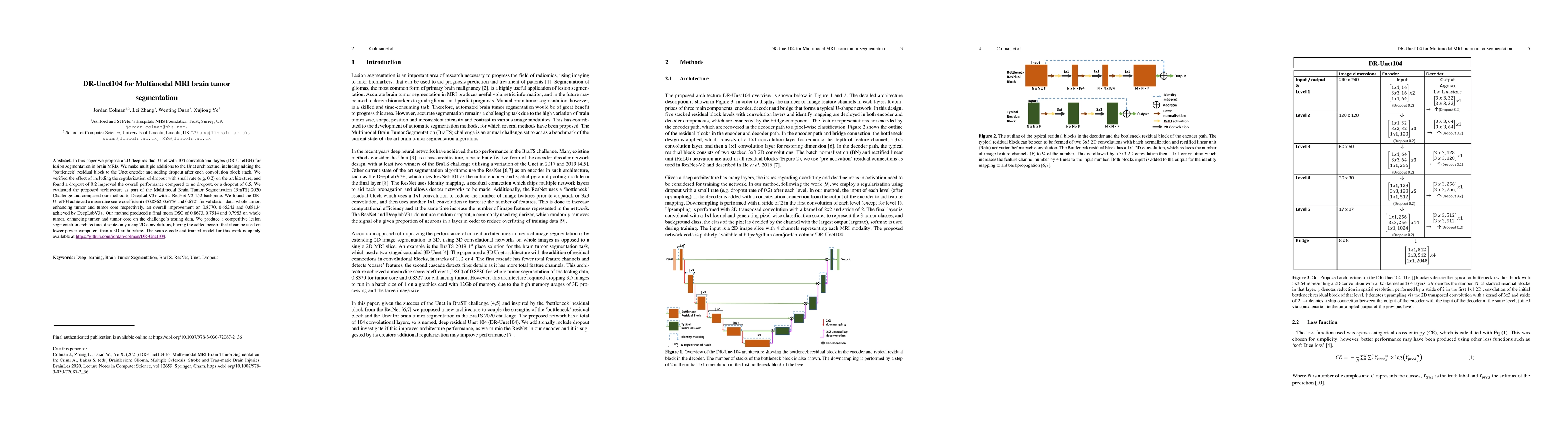 In this paper we propose a 2D deep residual Unet with 104 convolutional layers (DR-Unet104) for lesion segmentation in brain MRIs. We make multiple additions to the Unet architecture, including adding the 'bottleneck' residual block to the Unet encoder and adding dropout after each convolution block stack. We verified the effect of introducing the regularisation of dropout with small rate (e.g. 0.2) on the architecture, and found a dropout of 0.2 improved the overall performance compared to no dropout, or a dropout of 0.5. We evaluated the proposed architecture as part of the Multimodal Brain Tumor Segmentation (BraTS) 2020 Challenge and compared our method to DeepLabV3+ with a ResNet-V2-152 backbone. We found that the DR-Unet104 achieved a mean dice score coefficient of 0.8862, 0.6756 and 0.6721 for validation data, whole tumor, enhancing tumor and tumor core respectively, an overall improvement on 0.8770, 0.65242 and 0.68134 achieved by DeepLabV3+. Our method produced a final mean DSC of 0.8673, 0.7514 and 0.7983 on whole tumor, enhancing tumor and tumor core on the challenge's testing data. We produced a competitive lesion segmentation architecture, despite only 2D convolutions, having the added benefit that it can be used on lower power computers than a 3D architecture. The source code and trained model for this work is openly available at https://github.com/jordan-colman/DR-Unet104.