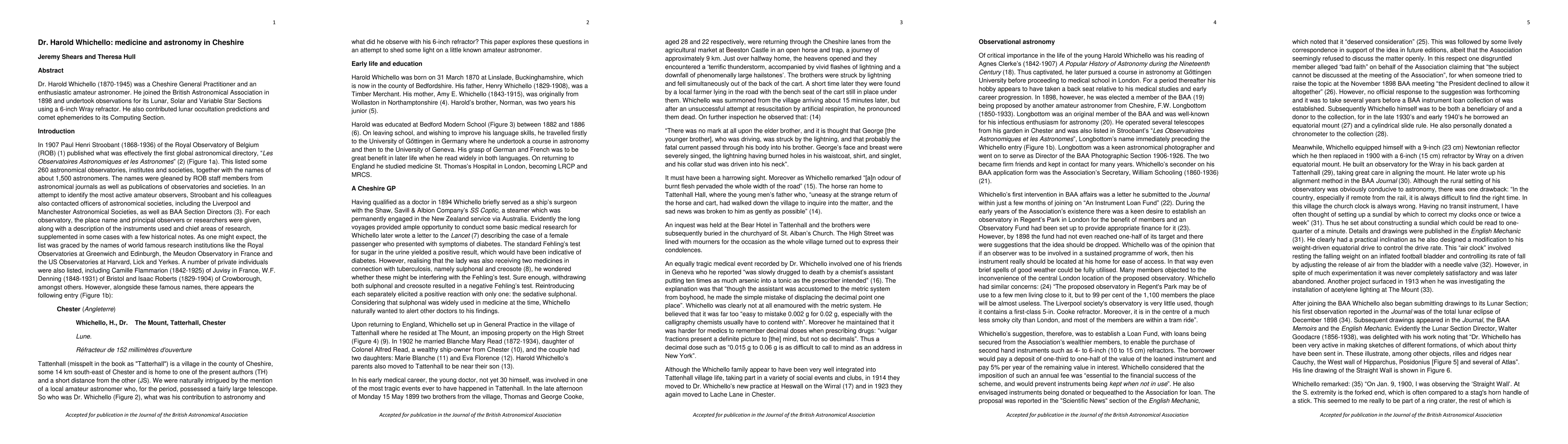Dr. Harold Whichello (1870-1945) was a Cheshire General Practitioner and an enthusiastic amateur astronomer. He joined the British Astronomical Association in 1898 and undertook observations for its Lunar, Solar and Variable Star Sections using a 6-inch Wray refractor. He also contributed lunar occultation predictions and comet ephemerides to its Computing Section.