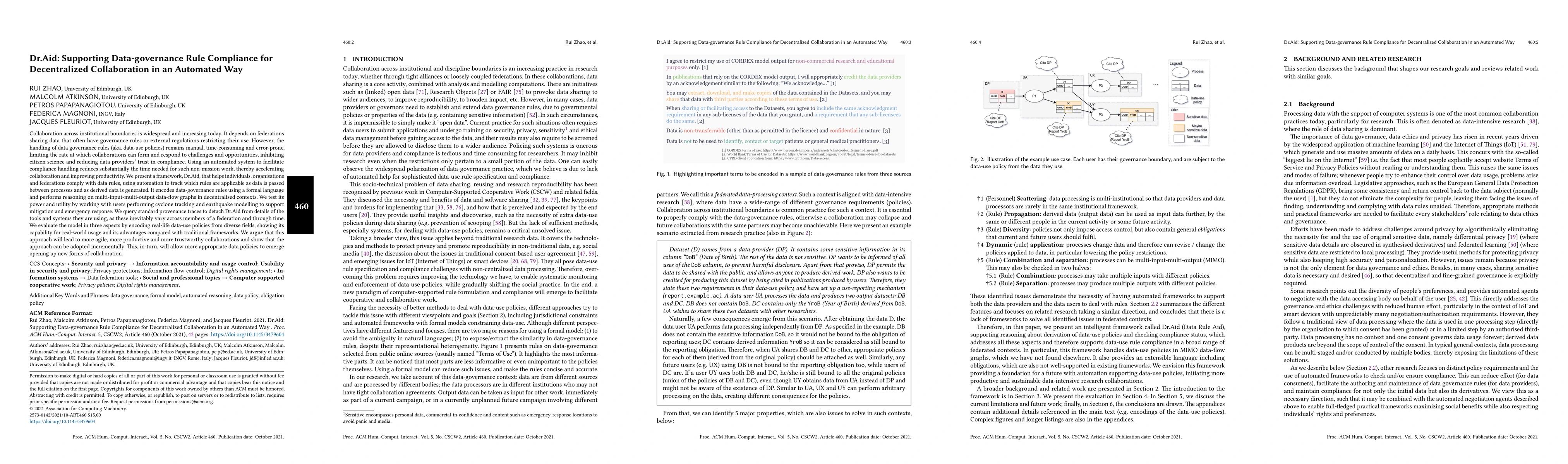 Dr.Aid automates the compliance with data-governance rules in decentralized collaborations, reducing manual effort and time. It uses a formal language to encode rules and reason over data-flow graphs, tested in cyclone tracking and earthquake modelling, demonstrating its real-world utility and advantages over traditional methods.
