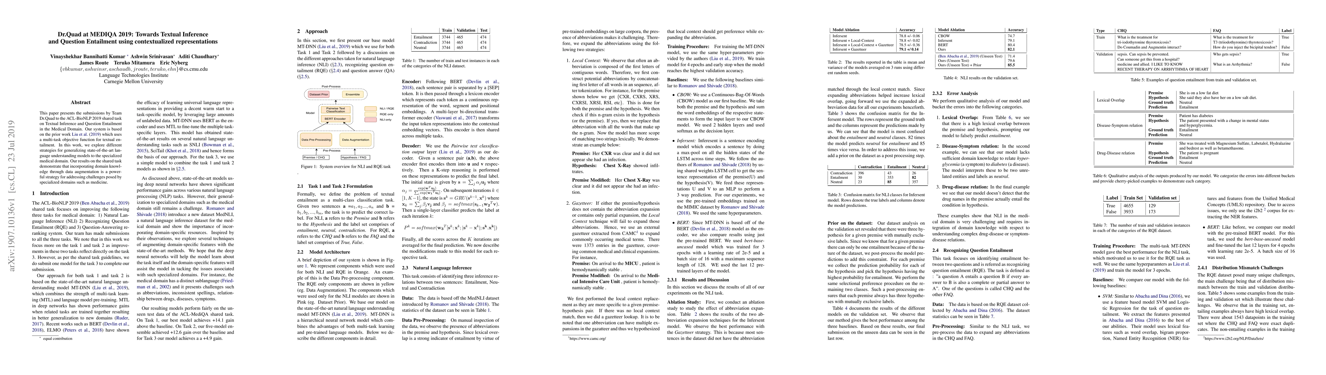 This paper presents the submissions by Team Dr.Quad to the ACL-BioNLP 2019 shared task on Textual Inference and Question Entailment in the Medical Domain. Our system is based on the prior work Liu et al. (2019) which uses a multi-task objective function for textual entailment. In this work, we explore different strategies for generalizing state-of-the-art language understanding models to the specialized medical domain. Our results on the shared task demonstrate that incorporating domain knowledge through data augmentation is a powerful strategy for addressing challenges posed by specialized domains such as medicine.