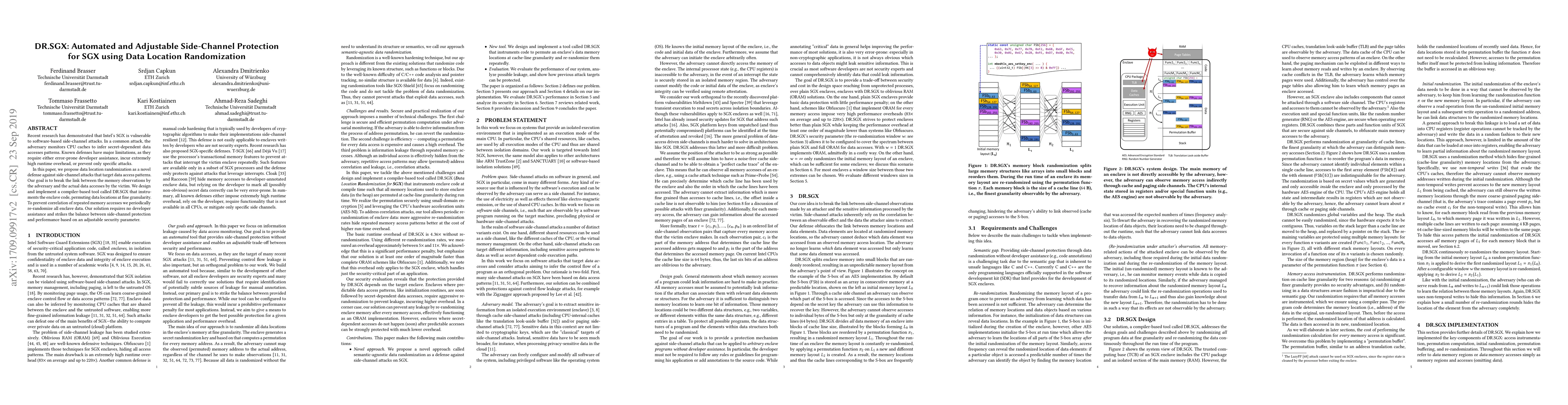 This paper proposes a novel defense mechanism called DR.SGX to protect Intel's SGX enclaves against cache-based side-channel attacks by randomizing data locations. The solution aims to break the correlation between adversary cache observations and actual data accesses, achieving a balance between security and performance.