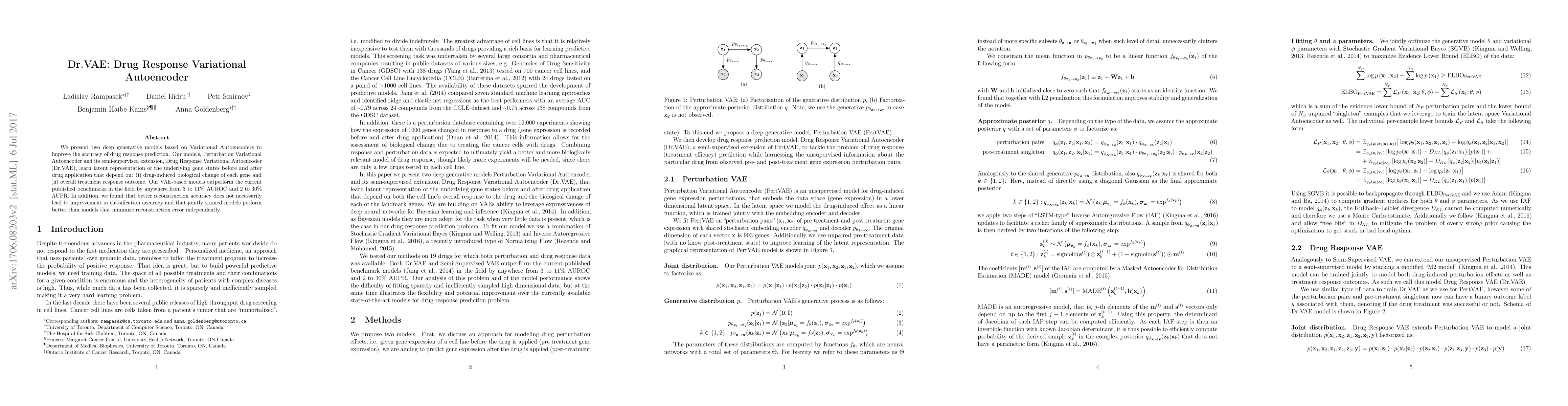 We present two deep generative models based on Variational Autoencoders to improve the accuracy of drug response prediction. Our models, Perturbation Variational Autoencoder and its semi-supervised extension, Drug Response Variational Autoencoder (Dr.VAE), learn latent representation of the underlying gene states before and after drug application that depend on: (i) drug-induced biological change of each gene and (ii) overall treatment response outcome. Our VAE-based models outperform the current published benchmarks in the field by anywhere from 3 to 11% AUROC and 2 to 30% AUPR. In addition, we found that better reconstruction accuracy does not necessarily lead to improvement in classification accuracy and that jointly trained models perform better than models that minimize reconstruction error independently.