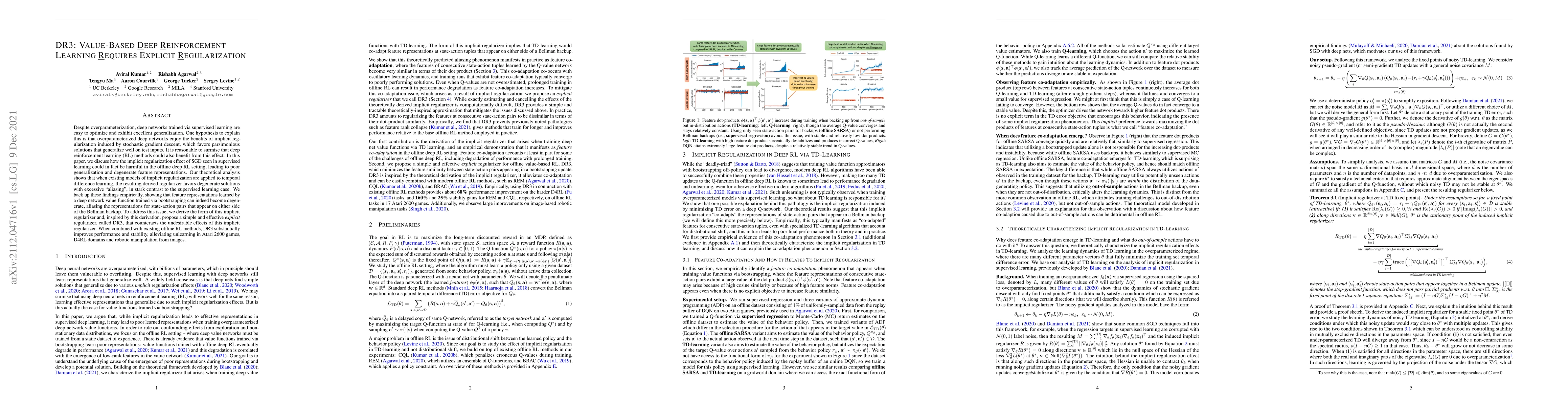 This paper argues that implicit regularization in supervised learning is harmful in offline deep reinforcement learning, causing poor generalization and degenerate feature representations. It proposes an explicit regularizer, DR3, which effectively counteracts these issues, significantly improving performance and stability in various RL environments.