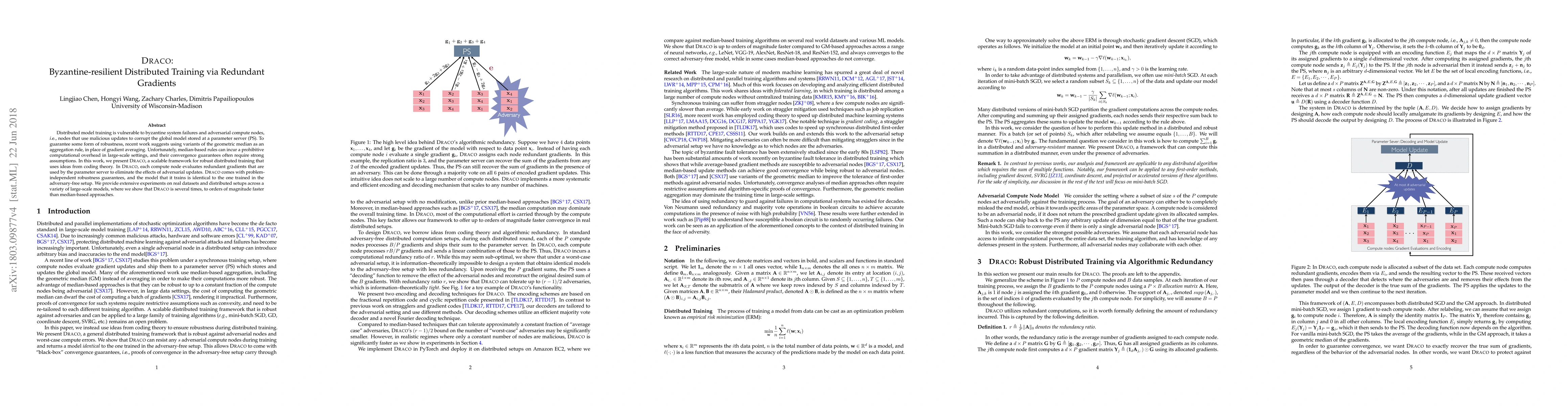 DRACO introduces a scalable framework for robust distributed training using redundant gradients to counteract adversarial nodes, offering robust guarantees without the computational overhead of median-based aggregation methods. Experiments demonstrate DRACO's significant speed advantages over median-based approaches in large-scale models.