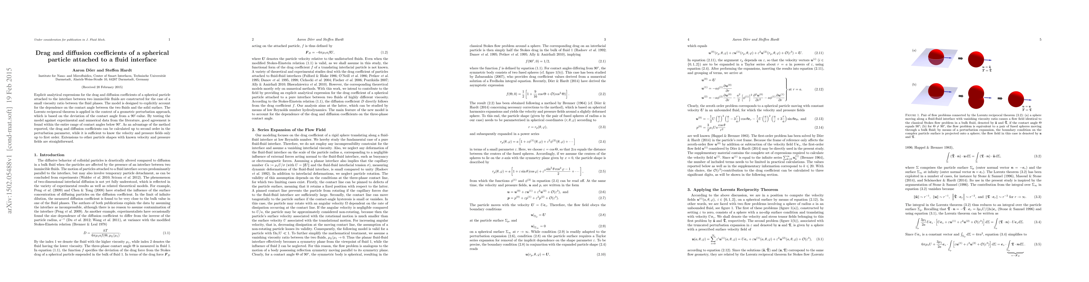 This paper derives analytical expressions for drag and diffusion coefficients of a spherical particle at a fluid interface, considering small viscosity ratios and varying contact angles. The model uses a geometric perturbation approach and agrees well with experimental and numerical data, allowing for second-order calculations of coefficients while requiring only first-order velocity and pressure fields.