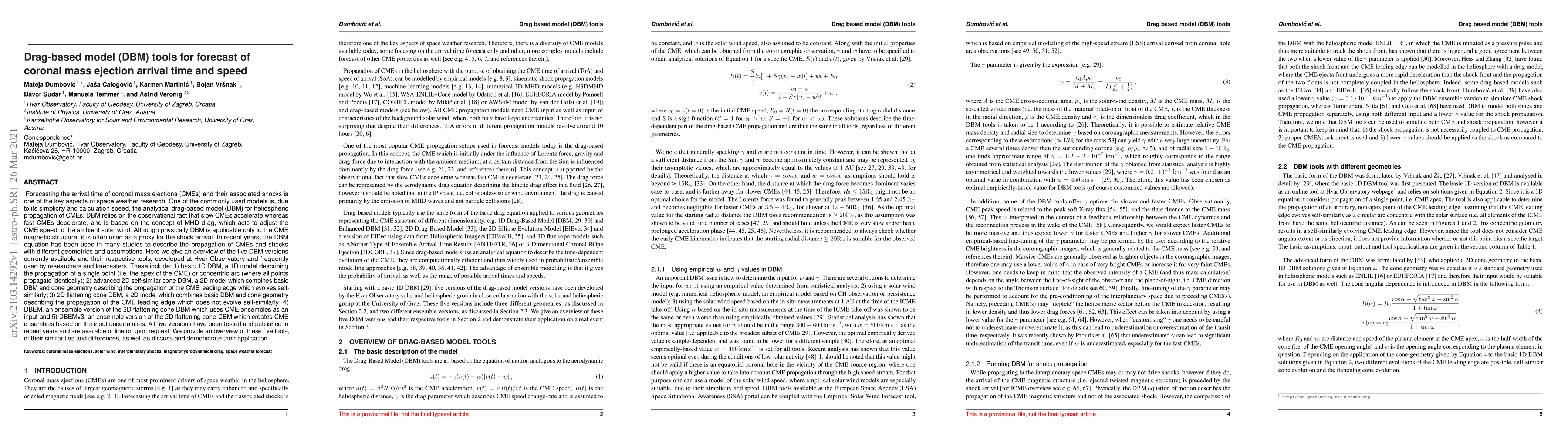 The paper reviews five versions of the drag-based model (DBM) tools for forecasting coronal mass ejection (CME) arrival time and speed, highlighting their development, differences, and applications. These tools include basic 1D, advanced 2D self-similar and flattening cone DBMs, and their ensemble versions.