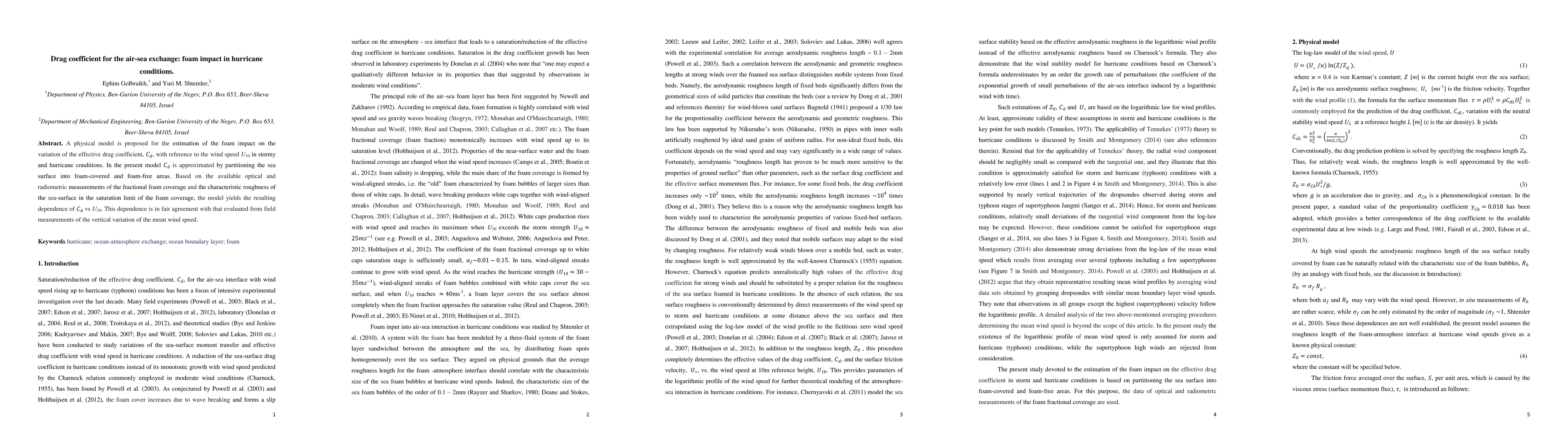 This paper proposes a physical model to estimate the foam impact on the effective drag coefficient (C_d) during hurricanes, partitioning the sea surface into foam-covered and foam-free areas. The model's predictions of C_d vs wind speed (U10) align well with field measurements of wind speed variations.