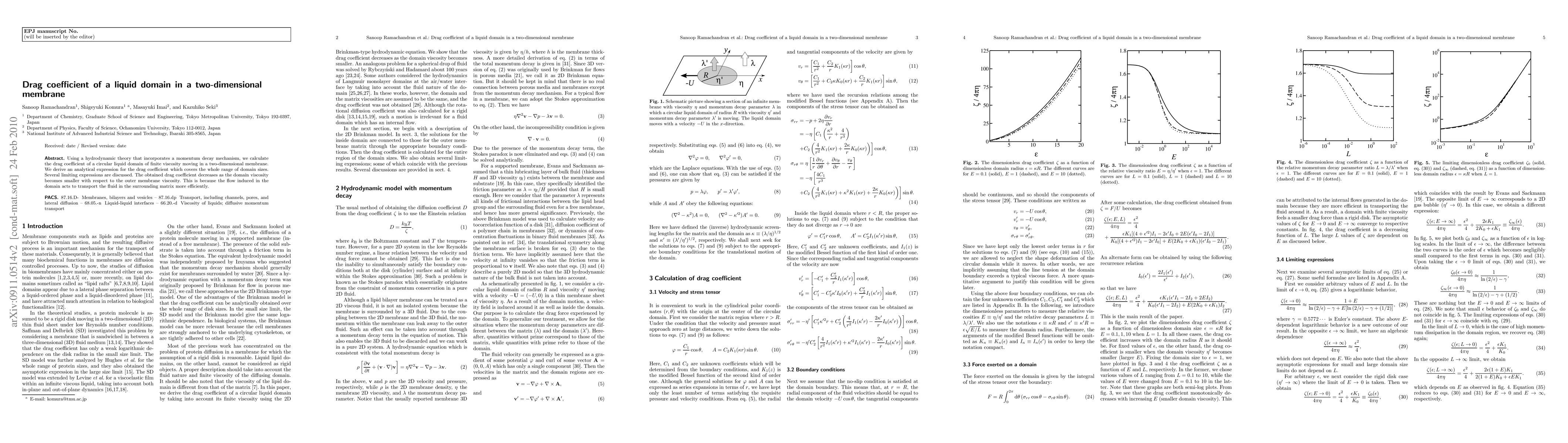 The paper presents an analytical expression for the drag coefficient of a viscous liquid domain moving through a two-dimensional membrane, derived using hydrodynamic theory. The drag coefficient decreases with lower domain viscosity, enhancing the efficiency of surrounding fluid transport.