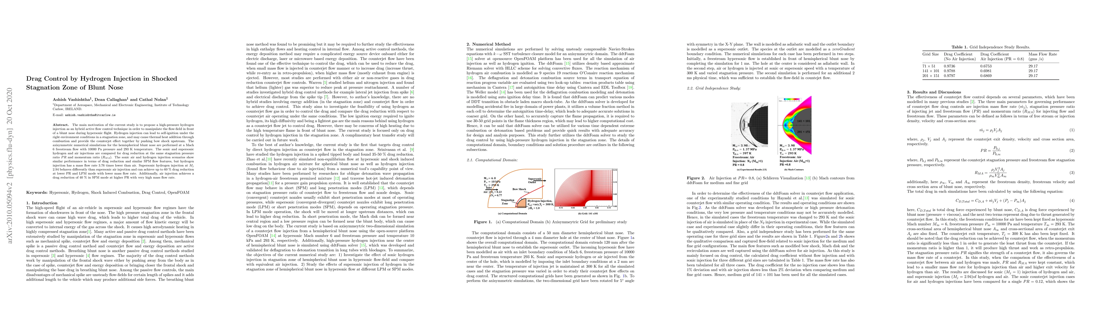 The main motivation of the current study is to propose a high-pressure hydrogen injection as an hybrid active flow control technique in order to manipulate the flow-field in front of a blunt nose during hypersonic flight. Hydrogen injection can lead to self-igition under the right environment conditions in a stagnation zone, and may cause thermal heat addition through combustion and provide the counterjet effect together by pushing bow shock upstream. The axisymmetric numerical simulations for the hemispherical blunt nose are performed at a Mach 6 freestream flow with 10000 Pa pressure and 293 K temperature. The sonic and supersonic hydrogen and air injections are compared for drag reduction at the same stagnation pressure ratio $PR$ and momentum ratio ($R_{MA}$). The sonic air and hydrogen injection scenarios show similar performance in terms of drag reduction and similar SPM flow features, but hydrogen injection has a mass flow rate 3.76 times lower than air. Supersonic hydrogen injection at $M_j$ 2.94 behaves differently than supersonic air injection and can achieve up to 60 % drag reduction at lower PR and LPM mode with lower mass flow rate. Additionally, air injection achieves a drag reduction of 40 % in SPM mode at higher PR with very high mass flow rate.