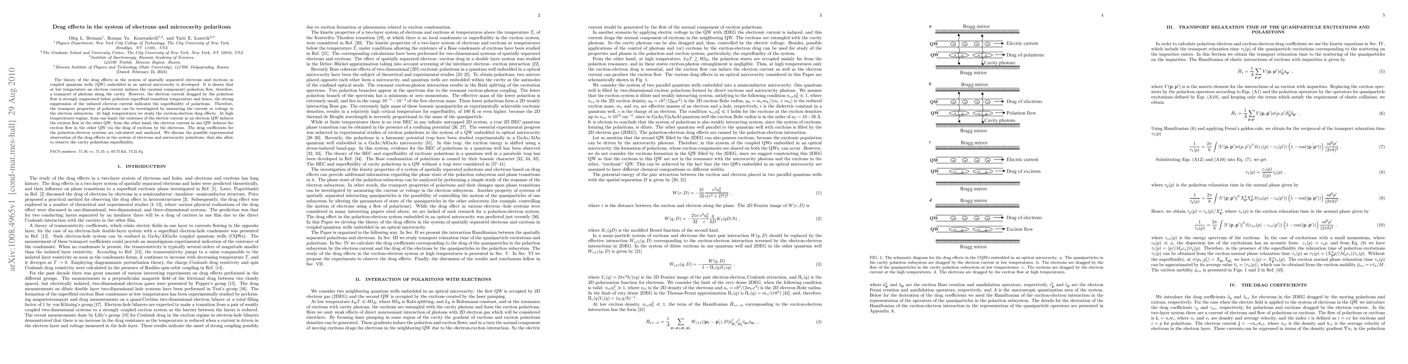 This paper develops a theoretical framework for drag effects in spatially separated electrons and excitons in quantum wells within an optical microcavity, revealing that electron current induces polariton flow and photon transport. It highlights the strong suppression of electron current below the polariton superfluid transition, indicating polariton superfluidity.