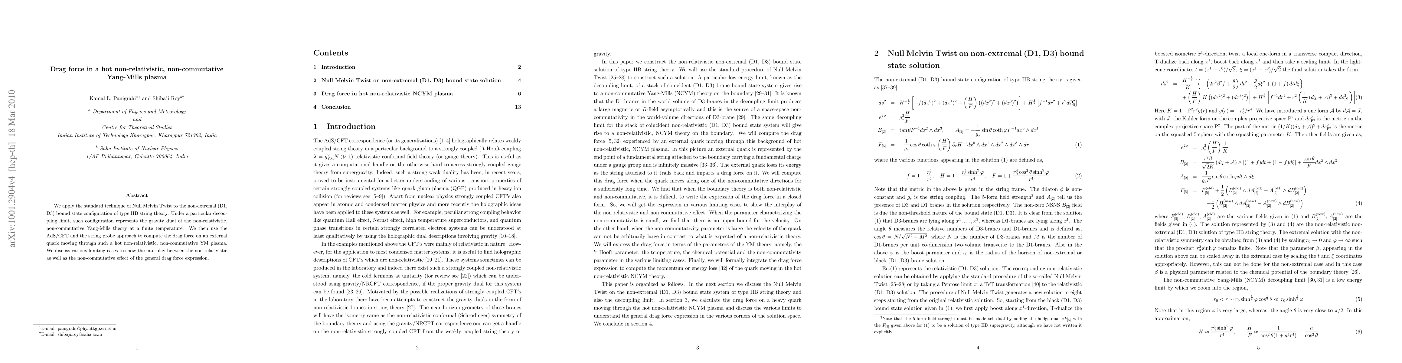 This paper computes the drag force on a quark in a hot non-relativistic, non-commutative Yang-Mills plasma using the Null Melvin Twist and the AdS/CFT correspondence, exploring the interplay between non-relativistic and non-commutative effects. The study employs a gravity dual from type IIB string theory to model the plasma.