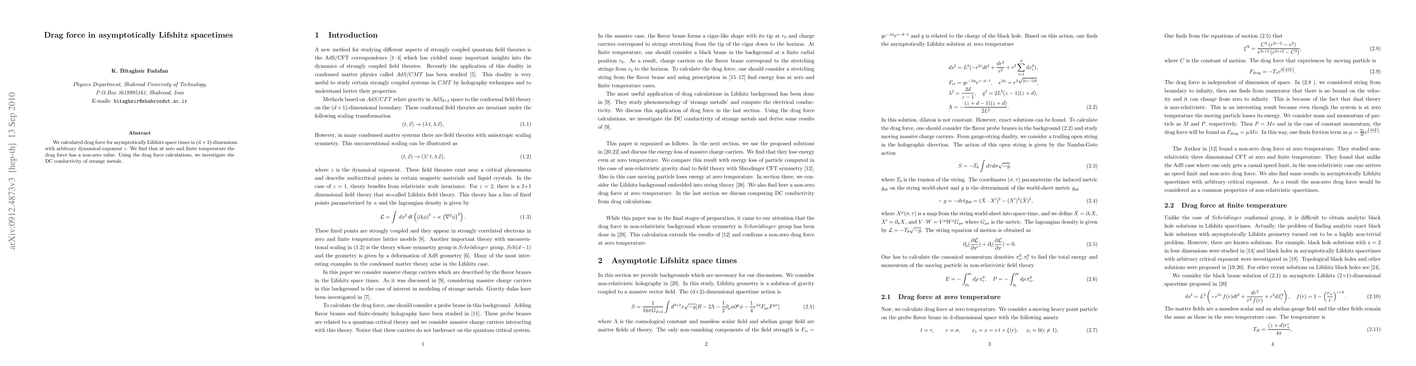 This paper calculates the drag force in asymptotically Lifshitz spacetimes across dimensions with an arbitrary dynamical exponent $z$, revealing a non-zero drag force at both zero and finite temperatures. It also uses these findings to explore the DC conductivity of strange metals.