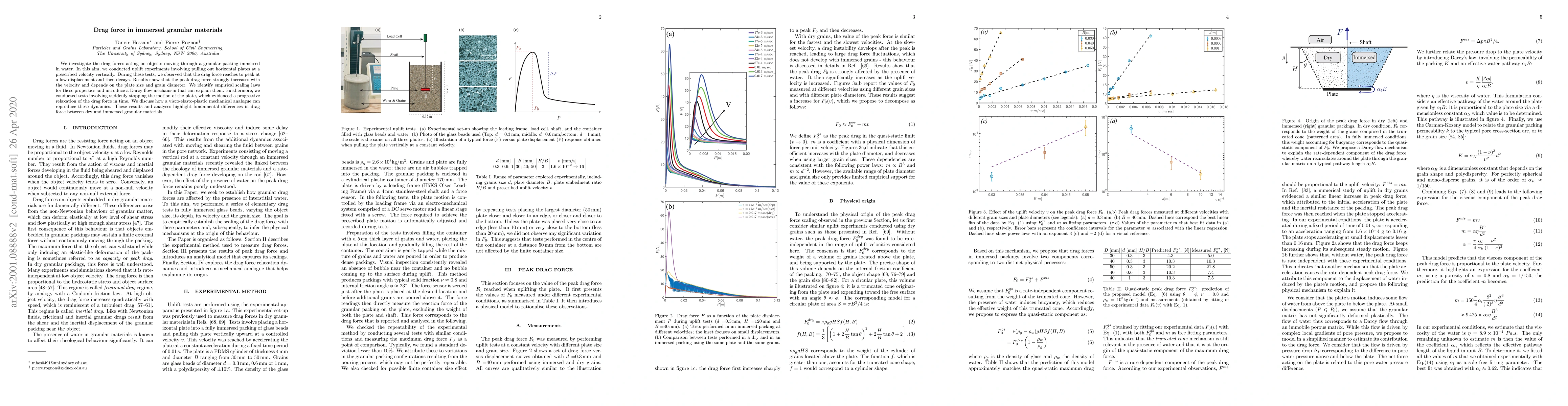 This study investigates drag forces on large objects moving through water-immersed granular packings, finding peak drag forces that increase with velocity and depend on plate size and grain diameter. Empirical scaling laws and a Darcy-flow mechanism explain these observations, with a visco-elasto-plastic model capturing dynamic relaxation of drag forces upon motion cessation.