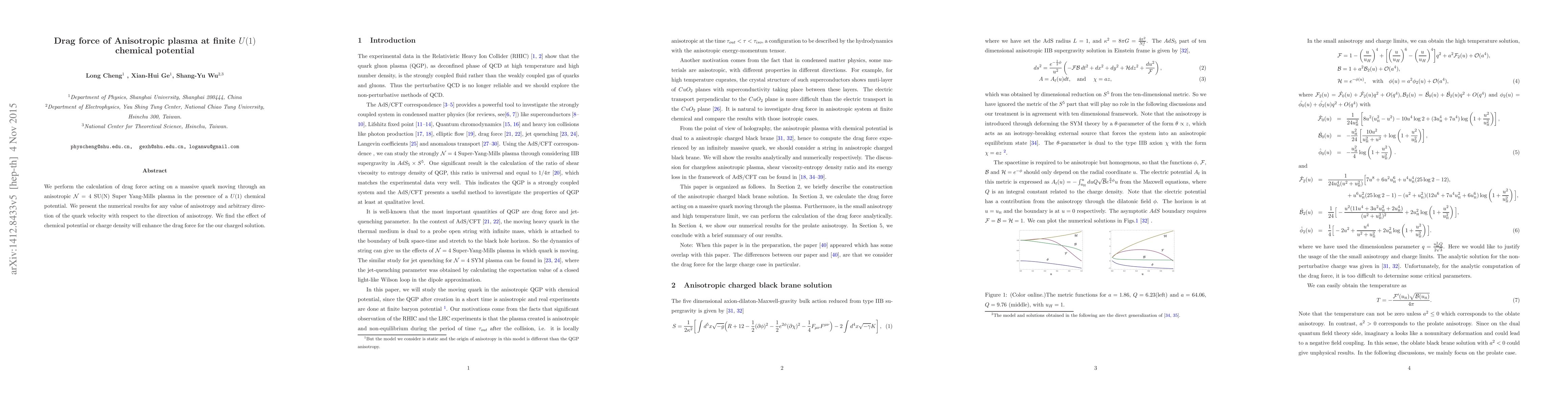 This paper investigates the drag force on a massive quark in anisotropic ${\cal N}=4$ Super Yang-Mills plasma with finite U(1) chemical potential, presenting numerical results that show enhanced drag force due to the presence of chemical potential or charge density. The analysis covers various degrees of anisotropy and directions of quark velocity.