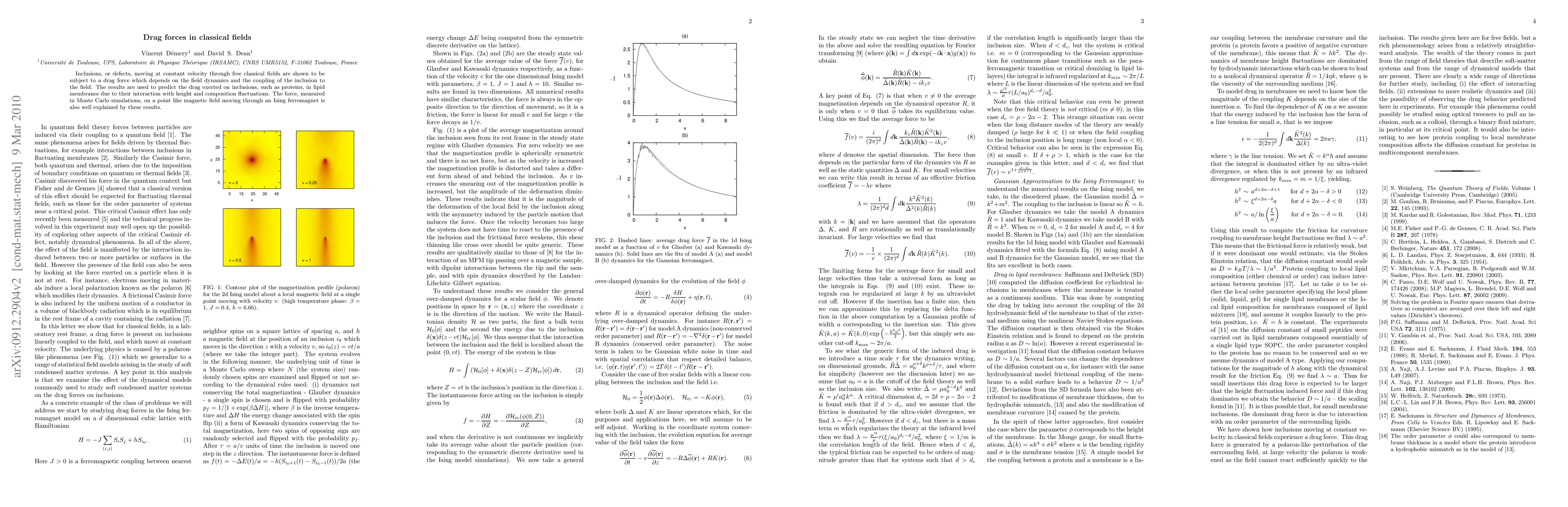 Inclusions, or defects, moving at constant velocity through free classical fields are shown to be subject to a drag force which depends on the field dynamics and the coupling of the inclusion to the field. The results are used to predict the drag exerted on inclusions, such as proteins, in lipid membranes due to their interaction with height and composition fluctuations. The force, measured in Monte Carlo simulations, on a point like magnetic field moving through an Ising ferromagnet is also well explained by these results.
