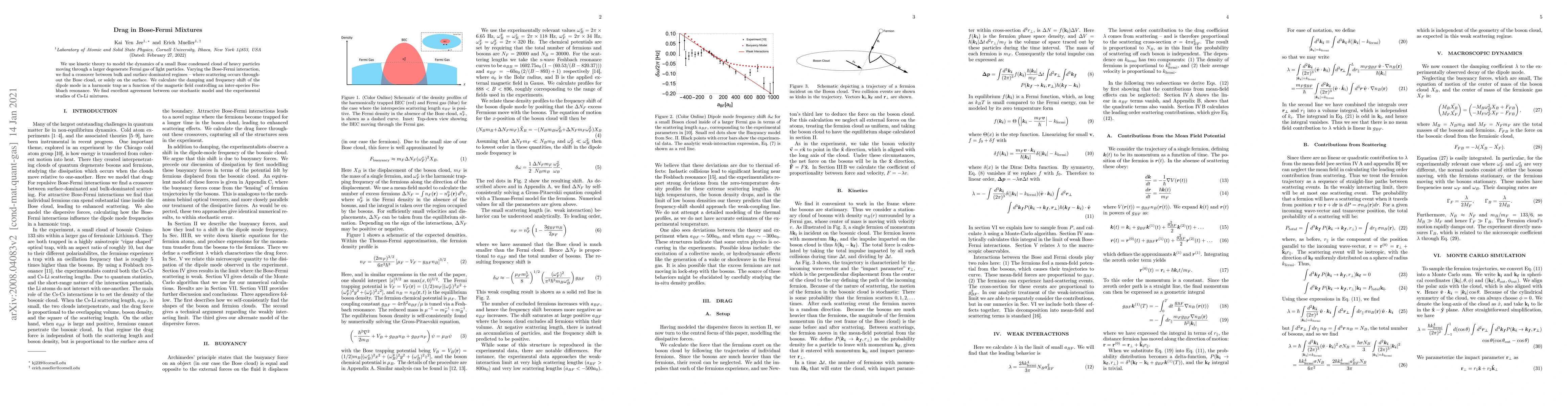 We use kinetic theory to model the dynamics of a small Bose condensed cloud of heavy particles moving through a larger degenerate Fermi gas of light particles. Varying the Bose-Fermi interaction, we find a crossover between bulk and surface dominated regimes -- where scattering occurs throughout the Bose cloud, or solely on the surface. We calculate the damping and frequency shift of the dipole mode in a harmonic trap as a function of the magnetic field controlling an inter-species Feshbach resonance. We find excellent agreement between our stochastic model and the experimental studies of Cs-Li mixtures.