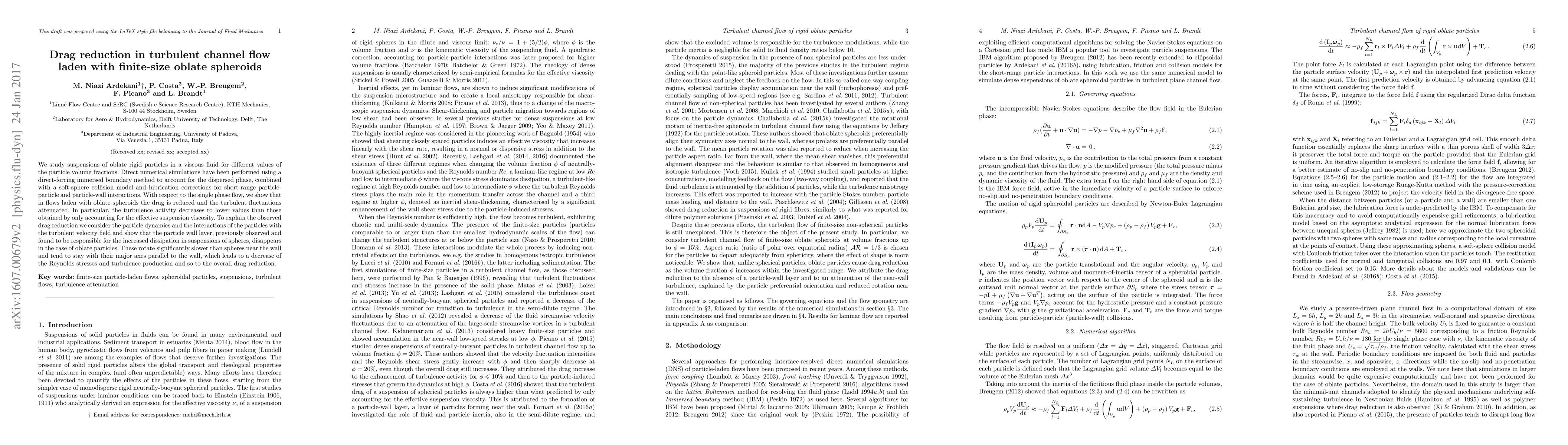 This paper investigates the drag reduction in turbulent channel flow containing oblate spheroids using direct numerical simulations. The simulations reveal that the presence of oblate spheroids reduces drag and attenuates turbulent fluctuations more than expected from the effective suspension viscosity alone, due to the altered particle dynamics and reduced interaction with the turbulent wall layer.