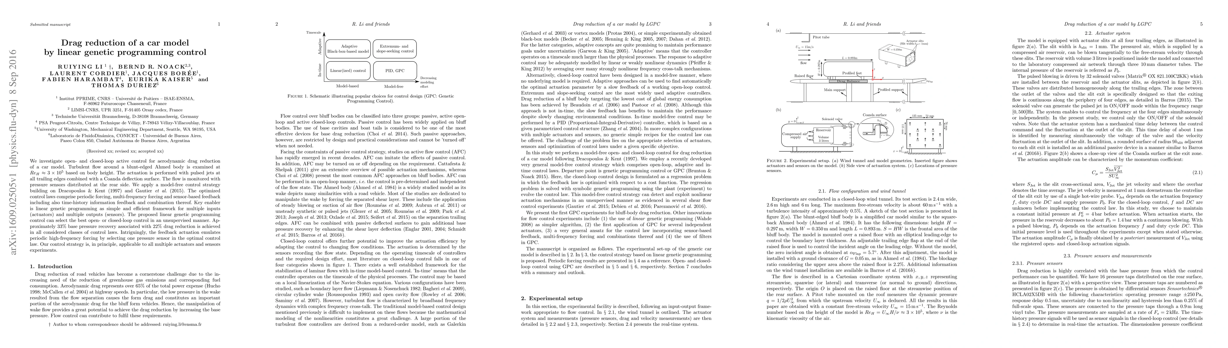 This study explores the use of linear genetic programming for optimizing active control strategies to reduce aerodynamic drag on a car model, achieving approximately 22% drag reduction through various control laws, including sensor-based feedback and multi-frequency forcing. The method effectively selects the best control approach in an unsupervised manner, emulating high-frequency forcing with feedback from a single pressure sensor.