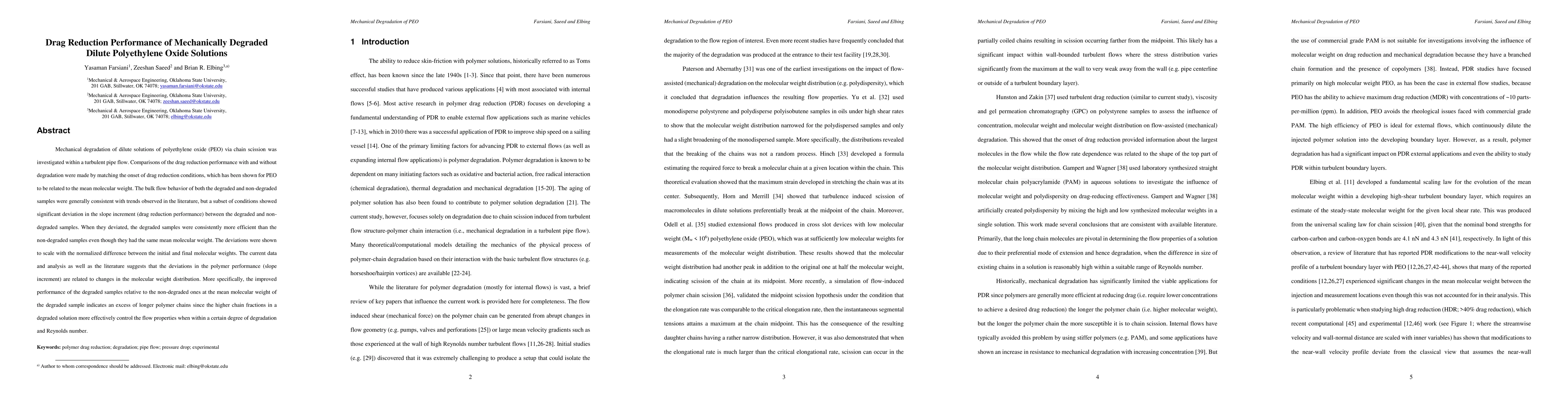 Mechanical degradation of dilute solutions of polyethylene oxide (PEO) via chain scission was investigated within a turbulent pipe flow. Comparisons of the drag reduction performance with and without degradation were made by matching the onset of drag reduction conditions, which has been shown for PEO to be related to the mean molecular weight. The bulk flow behavior of both the degraded and non-degraded samples were generally consistent with trends observed in the literature, but a subset of conditions showed significant deviation in the slope increment (drag reduction performance) between the degraded and non-degraded samples. When they deviated, the degraded samples were consistently more efficient than the non-degraded samples even though they had the same mean molecular weight. The deviations were shown to scale with the normalized difference between the initial and final molecular weights. The current data and analysis as well as the literature suggests that the deviations in the polymer performance (slope increment) are related to changes in the molecular weight distribution. More specifically, the improved performance of the degraded samples relative to the non-degraded ones at the mean molecular weight of the degraded sample indicates an excess of longer polymer chains since the higher chain fractions in a degraded solution more effectively control the flow properties when within a certain degree of degradation and Reynolds number.
