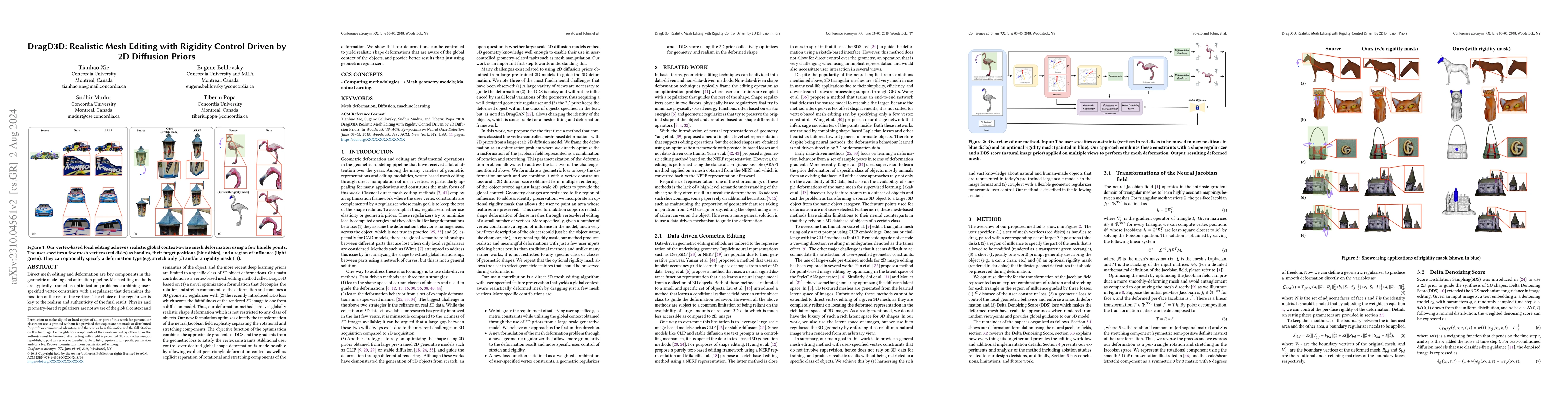 DragD3D introduces a local mesh editing method for realistic deformations by combining geometric ARAP regularizers with 2D diffusion priors from a large-scale model. It achieves context-aware deformations through direct vertex manipulation, outperforming traditional geometric methods.