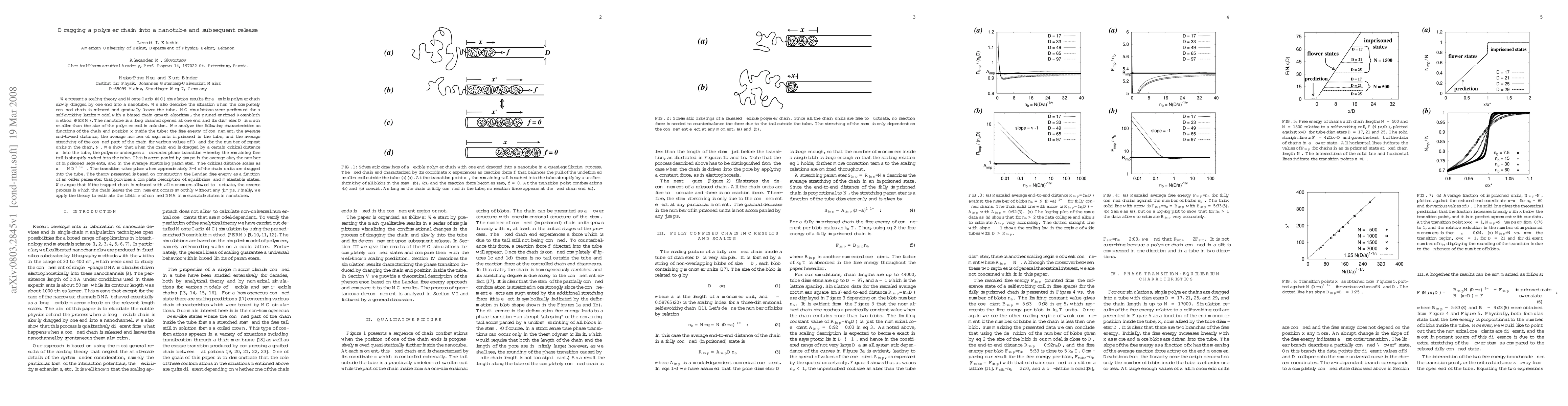 We present a scaling theory and Monte Carlo (MC) simulation results for a flexible polymer chain slowly dragged by one end into a nanotube. We also describe the situation when the completely confined chain is released and gradually leaves the tube. MC simulations were performed for a self-avoiding lattice model with a biased chain growth algorithm, the pruned-enriched Rosenbluth method. The nanotube is a long channel opened at one end and its diameter $D$ is much smaller than the size of the polymer coil in solution. We analyze the following characteristics as functions of the chain end position $x$ inside the tube: the free energy of confinement, the average end-to-end distance, the average number of imprisoned monomers, and the average stretching of the confined part of the chain for various values of $D$ and for the number of monomers in the chain, $N$. We show that when the chain end is dragged by a certain critical distance $x^*$ into the tube, the polymer undergoes a first-order phase transition whereby the remaining free tail is abruptly sucked into the tube. This is accompanied by jumps in the average size, the number of imprisoned segments, and in the average stretching parameter. The critical distance scales as $x^*\sim ND^{1-1/\nu}$. The transition takes place when approximately 3/4 of the chain units are dragged into the tube. The theory presented is based on constructing the Landau free energy as a function of an order parameter that provides a complete description of equilibrium and metastable states. We argue that if the trapped chain is released with all monomers allowed to fluctuate, the reverse process in which the chain leaves the confinement occurs smoothly without any jumps. Finally, we apply the theory to estimate the lifetime of confined DNA in metastable states in nanotubes.