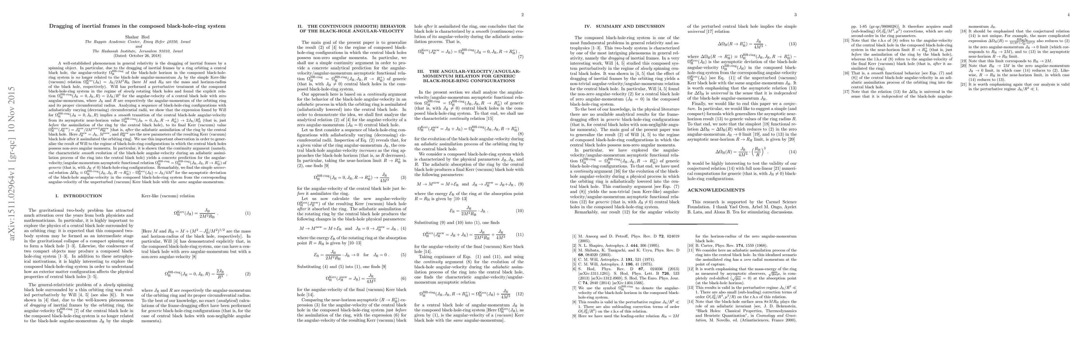 A well-established phenomenon in general relativity is the dragging of inertial frames by a spinning object. In particular, due to the dragging of inertial frames by a ring orbiting a central black hole, the angular-velocity of the black-hole horizon in the composed black-hole-ring system is no longer related to the black-hole angular-momentum by the simple Kerr-like (vacuum) relation $\Omega^{\text{Kerr}}_{\text{H}}(J_{\text{H}})=J_{\text{H}}/2M^2R_{\text{H}}$. Will has performed a perturbative treatment of the composed black-hole-ring system in the regime of slowly rotating black holes and found the explicit relation $\Omega^{\text{BH-ring}}_{\text{H}}(J_{\text{H}}=0,J_{\text{R}},R)=2J_{\text{R}}/R^3$ for the angular-velocity of a central black hole with zero angular-momentum. Analyzing a sequence of black-hole-ring configurations with adiabatically varying (decreasing) circumferential radii, we show that the expression found by Will implies a smooth transition of the central black-hole angular-velocity from its asymptotic near-horizon value $\Omega^{\text{BH-ring}}_{\text{H}}(J_{\text{H}}=0,J_{\text{R}},R\to R^{+}_{\text{H}})$ to its final Kerr (vacuum) value $\Omega^{\text{Kerr}}_{\text{H}}(J^{\text{new}}_{\text{H}})$. We use this important observation in order to generalize the result of Will to the regime of black-hole-ring configurations in which the central black holes possess non-zero angular momenta. Remarkably, we find the simple universal relation $\Delta\Omega_{\text{H}}\equiv\Omega^{\text{BH-ring}}_{\text{H}}(J_{\text{H}},J_{\text{R}},R\to R^{+}_{\text{H}})-\Omega^{\text{Kerr}}_{\text{H}}(J_{\text{H}})={{J_{\text{R}}}/{4M^3}}$ for the asymptotic deviation of the black-hole angular-velocity in the composed black-hole-ring system from the corresponding angular-velocity of the unperturbed (vacuum) Kerr black hole with the same angular-momentum.