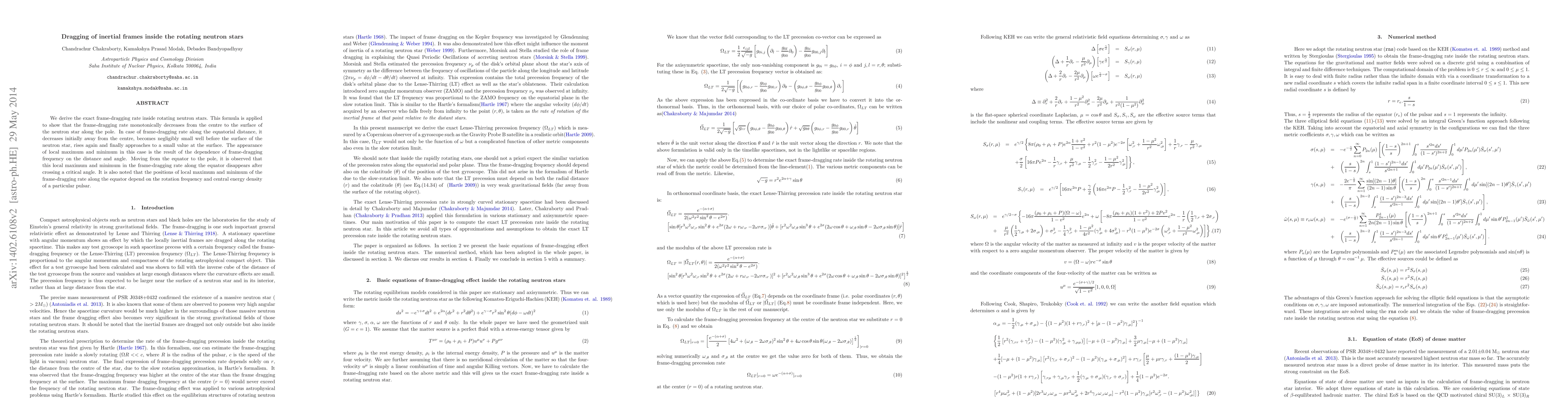 We derive the exact frame-dragging rate inside rotating neutron stars. This formula is applied to show that the frame-dragging rate monotonically decreases from the centre to the surface of the neutron star along the pole. In case of frame-dragging rate along the equatorial distance, it decreases initially away from the centre, becomes negligibly small well before the surface of the neutron star, rises again and finally approaches to a small value at the surface. The appearance of local maximum and minimum in this case is the result of the dependence of frame-dragging frequency on the distance and angle. Moving from the equator to the pole, it is observed that this local maximum and minimum in the frame dragging rate along the equator disappears after crossing a critical angle. It is also noted that the positions of local maximum and minimum of the frame-dragging rate along the equator depend on the rotation frequency and central energy density of a particular pulsar.