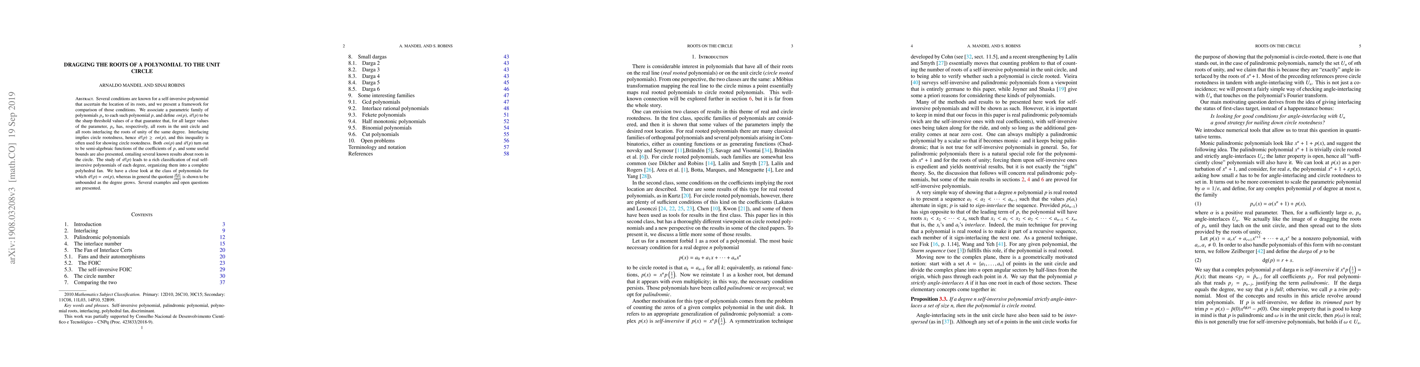 Several conditions are known for a self-inversive polynomial that ascertain the location of its roots, and we present a framework for comparison of those conditions. We associate a parametric family of polynomials $p_\alpha$ to each such polynomial $p$, and define $\mathscr{cn}(p)$, $\mathscr{il}(p)$ to be the sharp threshold values of $\alpha$ that guarantee that, for all larger values of the parameter, $p_\alpha$ has, respectively, all roots in the unit circle and all roots interlacing the roots of unity of the same degree. Interlacing implies circle rootedness, hence $\mathscr{il}(p)\geq\mathscr{cn}(p)$, and this inequality is often used for showing circle rootedness. Both $\mathscr{cn}(p)$ and $\mathscr{il}(p)$ turn out to be semi-algebraic functions of the coefficients of $p$, and some useful bounds are also presented, entailing several known results about roots in the circle. The study of $\mathscr{il}(p)$ leads to a rich classification of real self-inversive polynomials of each degree, organizing them into a complete polyhedral fan. We have a close look at the class of polynomials for which $\mathscr{il}(p)=\mathscr{cn}(p)$, whereas in general the quotient $\frac{\mathscr{il}(p)}{\mathscr{cn}(p)}$ is shown to be unbounded as the degree grows. Several examples and open questions are presented.
