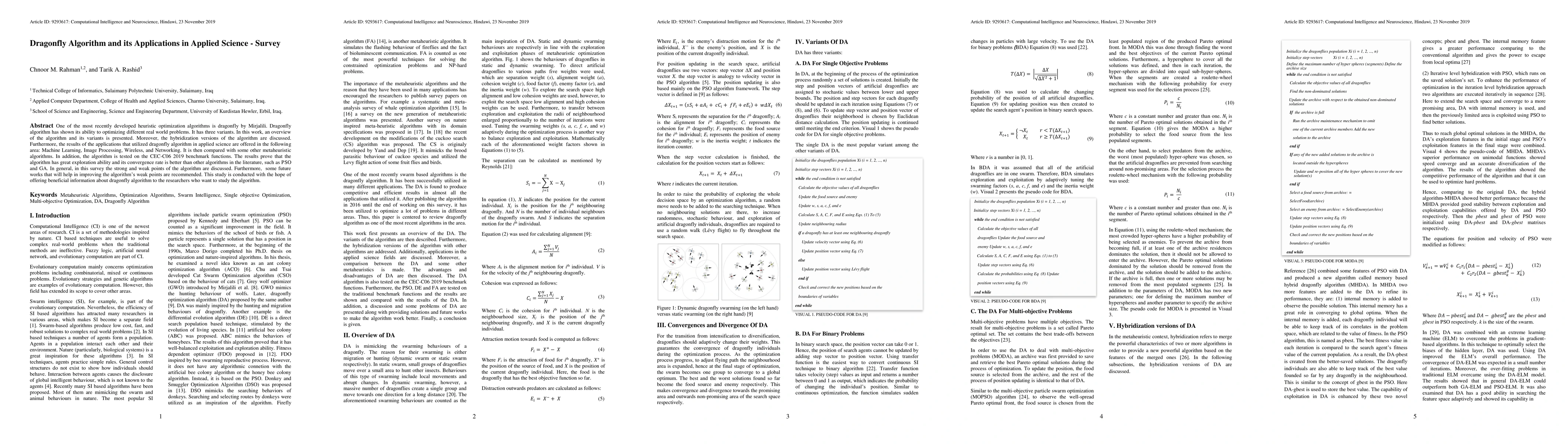 This survey provides an overview of the dragonfly algorithm, its variants, and hybrid versions, highlighting its applications in machine learning, image processing, wireless, and networking. It demonstrates superior exploration and convergence compared to other metaheuristic algorithms, while also discussing areas for future improvement.