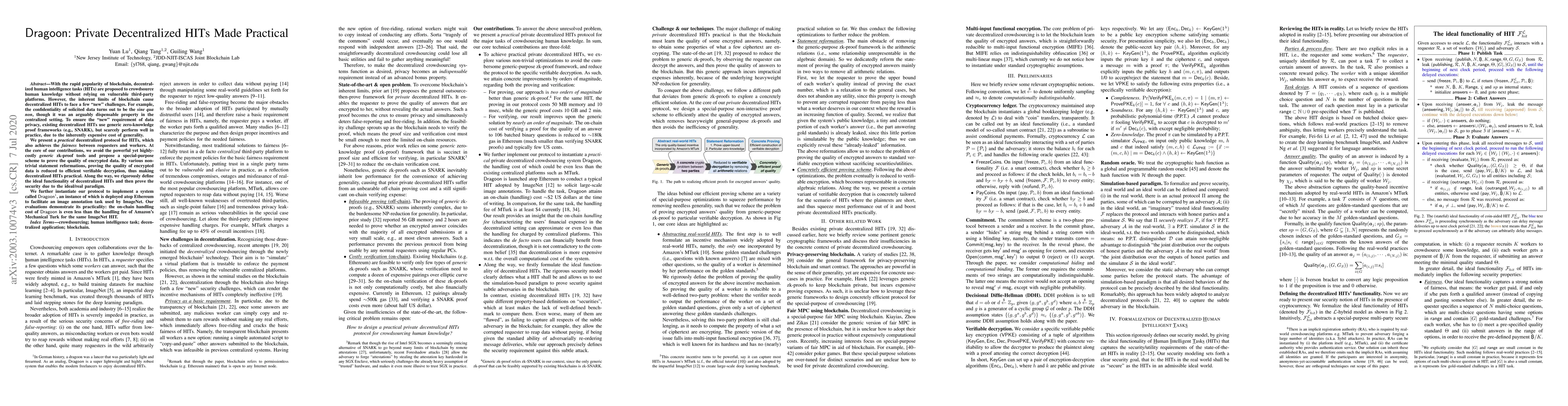 A new protocol called Dragoon makes decentralized human intelligence tasks (HITs) practical by providing a special-purpose scheme to prove the quality of encrypted data, reducing costs and increasing fairness between requesters and workers.