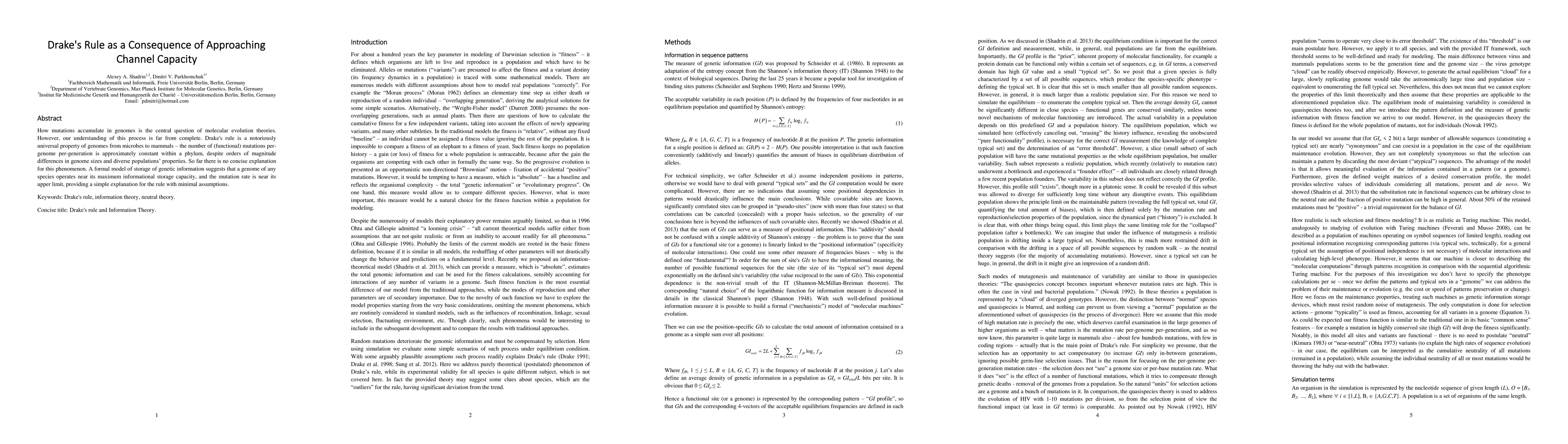 How mutations accumulate in genomes is the central question of molecular evolution theories, however our understanding of this process is far from complete. Drake's rule is a notoriously universal property of genomes from microbes to mammals - the number of (functional) mutations per-genome per-generation is approximately constant within a phylum, despite orders of magnitude differences in genome sizes and diverse populations properties. So far there is no concise explanation for this phenomenon. A formal model of storage of genetic information suggests that a genome of any species operates near its maximum informational storage capacity, and the mutation rate is near its upper limit, providing a simple explanation for the rule with minimal assumptions.