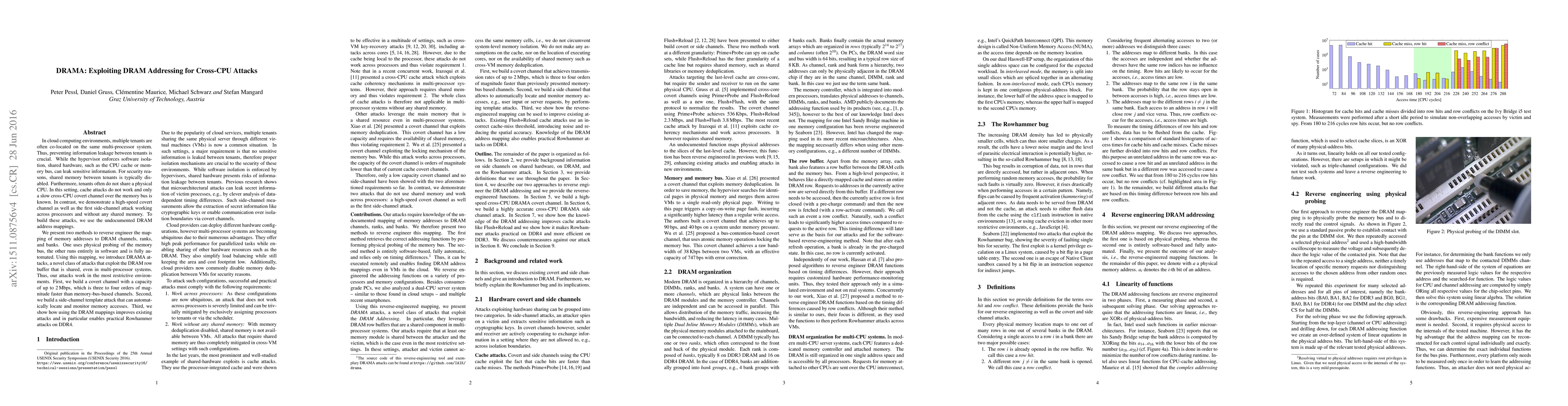 This paper presents DRAMA attacks that exploit undocumented DRAM addressing to enable high-speed covert channels and side-channel attacks across multiple CPUs in cloud environments without shared memory. It introduces two methods to reverse engineer DRAM address mappings and demonstrates their effectiveness in creating a covert channel and enhancing Rowhammer attacks.