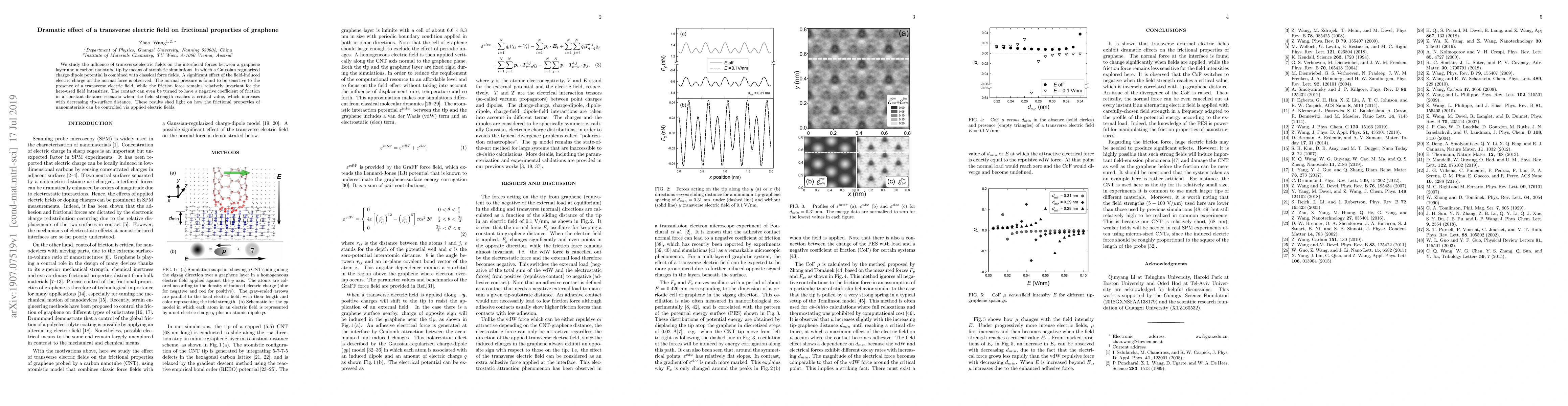 This study reveals that transverse electric fields significantly alter the normal force and frictional properties between graphene and a carbon nanotube tip, with the normal pressure being sensitive to the field while friction remains relatively constant. At high field strengths, the contact can exhibit negative friction, indicating potential for controlling nanomaterial friction via electric fields.