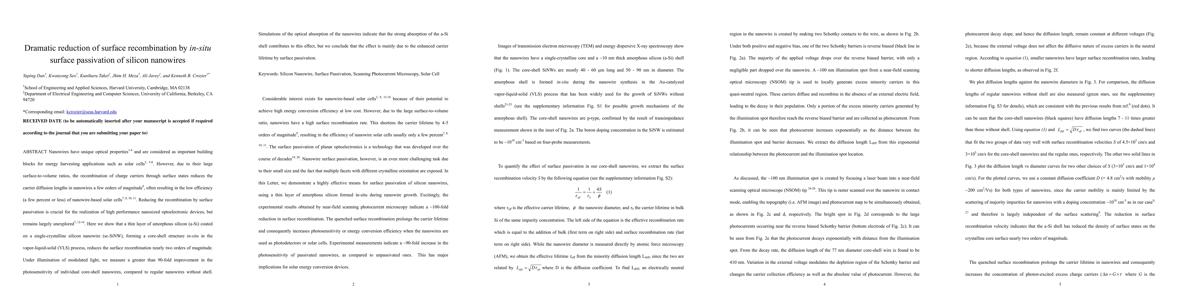 This paper demonstrates that in-situ surface passivation of silicon nanowires using a thin layer of amorphous silicon reduces surface recombination by nearly two orders of magnitude, significantly improving the photosensitivity and carrier lifetime, which is crucial for enhancing the efficiency of nanowire-based solar cells.