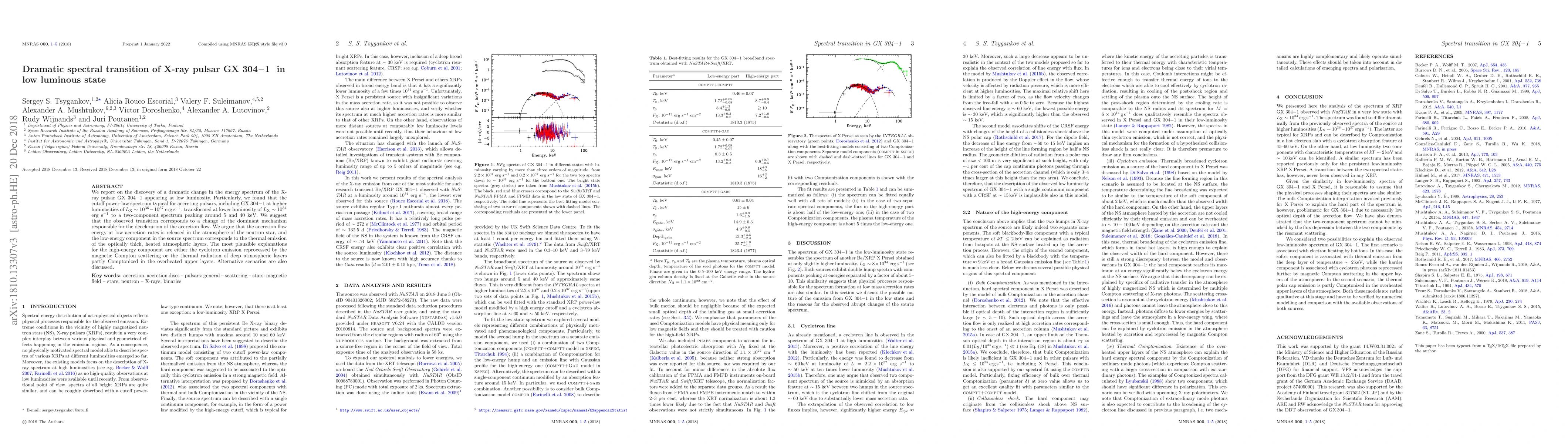 The X-ray pulsar GX 304-1 undergoes a dramatic change in its energy spectrum at low luminosity, shifting from a typical accreting pulsar power-law to a two-component spectrum with peaks around 5 and 40 keV. This transition is believed to result from a shift in the dominant mechanism responsible for decelerating the accretion flow.