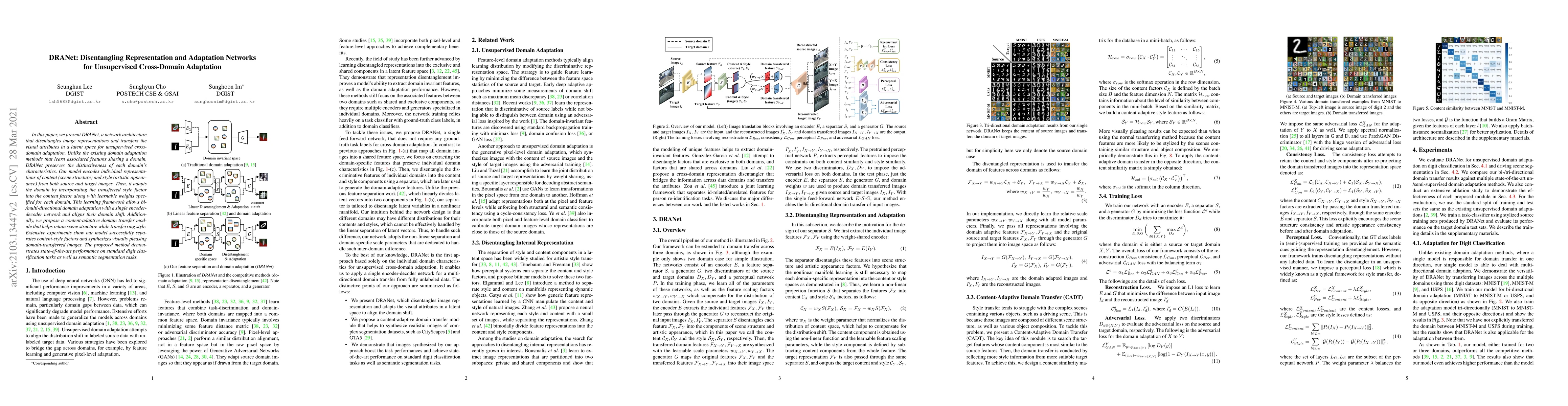 DRANet disentangles image representations and adapts visual attributes in a latent space for unsupervised cross-domain adaptation, achieving state-of-the-art performance by separately encoding content and style factors and utilizing a content-adaptive domain transfer module. The model allows bi-/multi-directional adaptation while preserving domain distinctiveness.