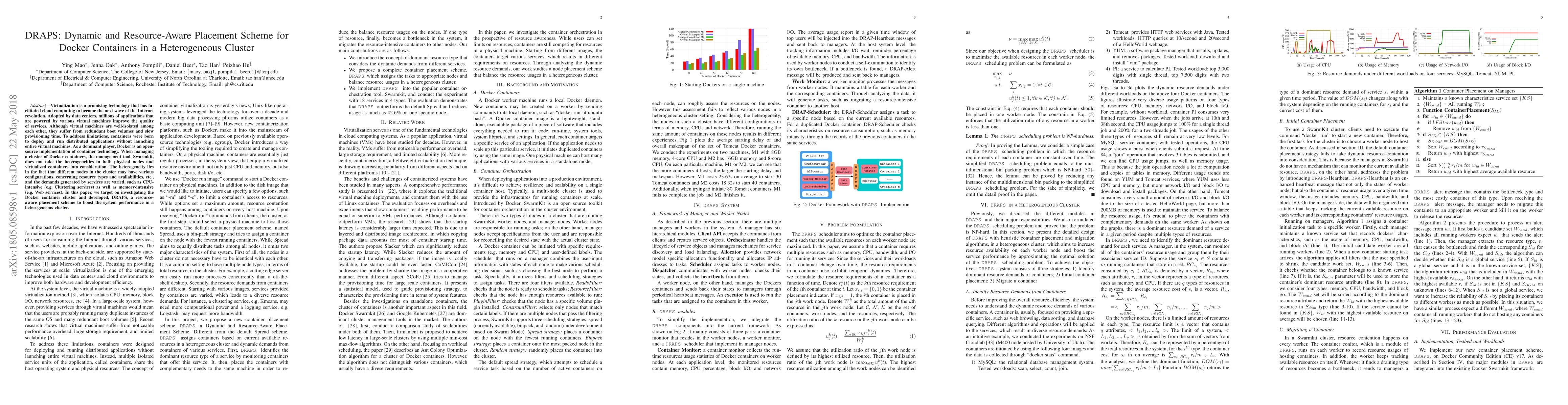 DRAPS, a resource-aware placement scheme for Docker containers in heterogeneous clusters, dynamically assigns containers based on their resource demands and current node availability.