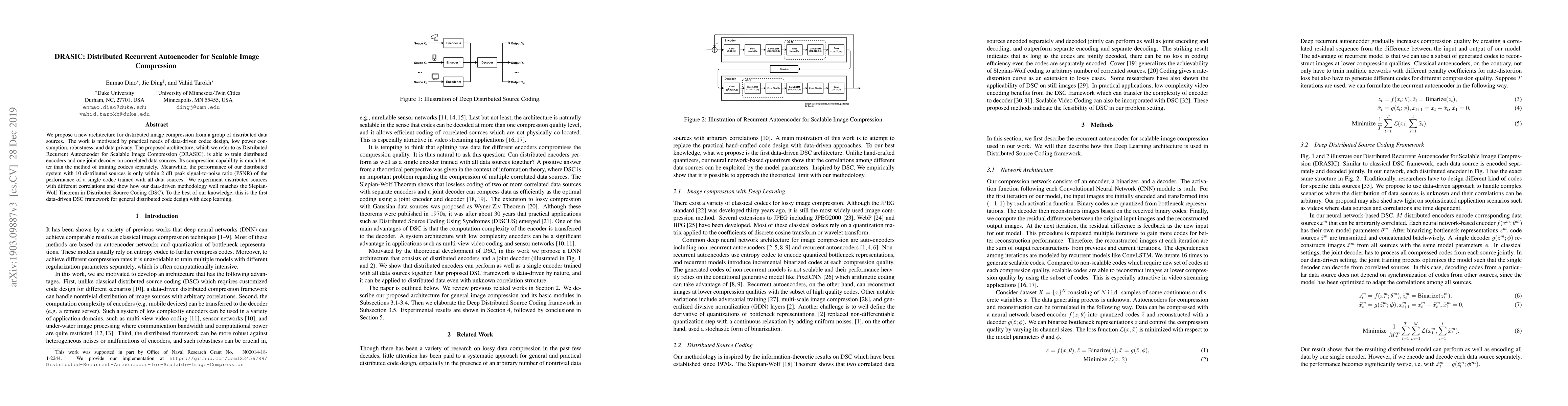 The DRASIC architecture proposes a distributed recurrent autoencoder for scalable image compression, achieving better compression efficiency than separate codecs while maintaining performance close to a single trained codec. This data-driven methodology aligns with the Slepian-Wolf Theorem in Distributed Source Coding.