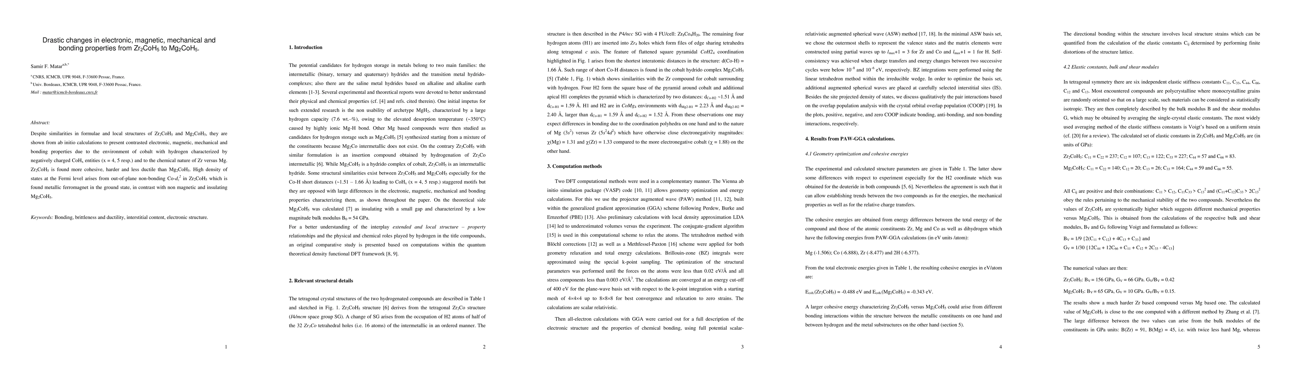 Ab initio calculations reveal stark differences in properties between Zr2CoH5 and Mg2CoH5, despite similar structures. Zr2CoH5 is described as a metallic ferromagnet, harder, and less ductile than Mg2CoH5, which is non-magnetic and insulating.