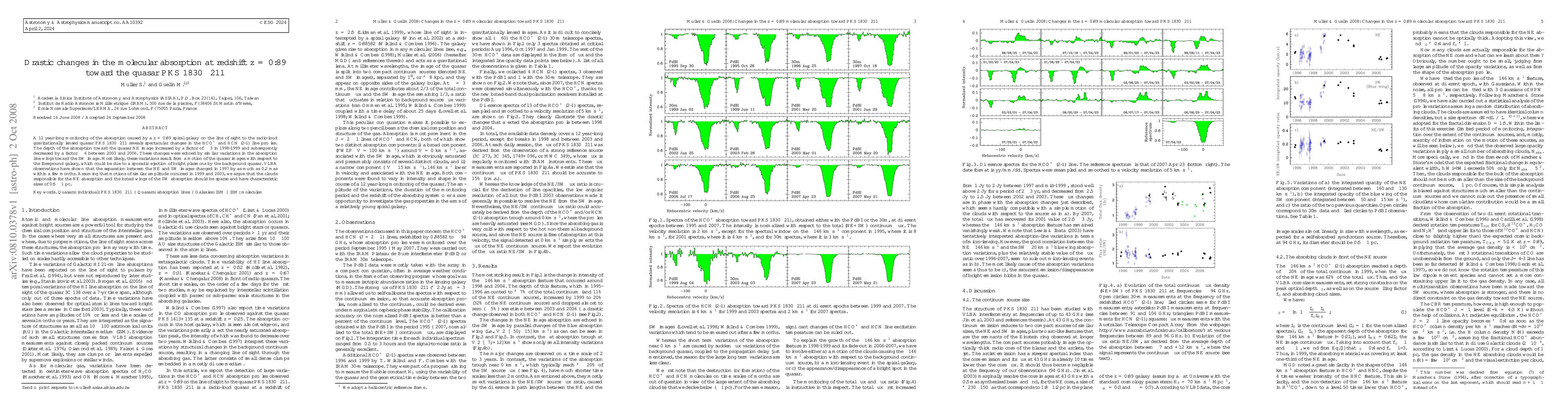 A 12 year-long monitoring of the absorption caused by a z=0.89 spiral galaxy on the line of sight to the radio-loud gravitationally lensed quasar PKS 1830-211 reveals spectacular changes in the HCO+ and HCN (2-1) line profiles. The depth of the absorption toward the quasar NE image increased by a factor of ~3 in 1998-1999 and subsequently decreased by a factor >=6 between 2003 and 2006. These changes were echoed by similar variations in the absorption line wings toward the SW image. Most likely, these variations result from a motion of the quasar images with respect to the foreground galaxy, which could be due to a sporadic ejection of bright plasmons by the background quasar. VLBA observations have shown that the separation between the NE and SW images changed in 1997 by as much as 0.2 mas within a few months. Assuming that motions of similar amplitude occurred in 1999 and 2003, we argue that the clouds responsible for the NE absorption and the broad wings of the SW absorption should be sparse and have characteristic sizes of 0.5-1 pc.