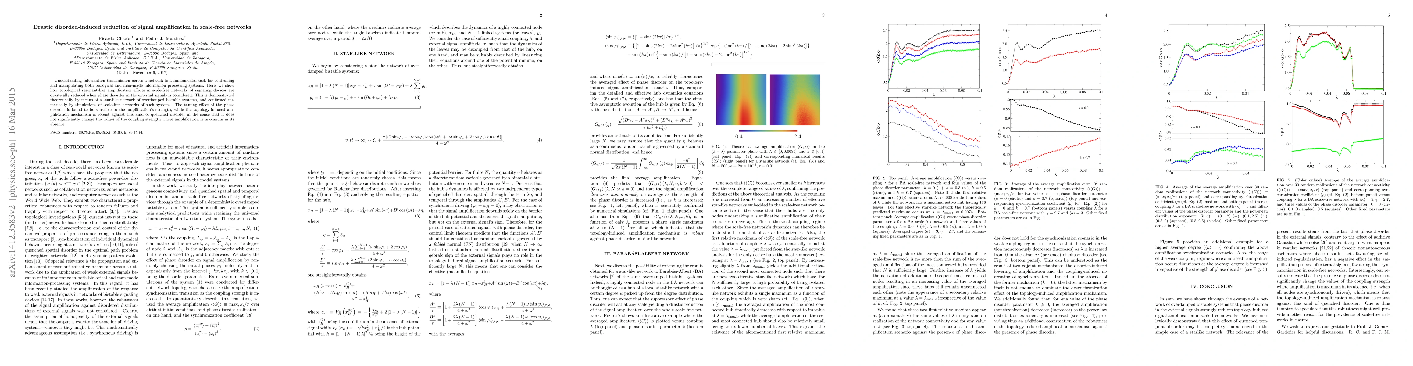 Understanding information transmission across a network is a fundamental task for controlling and manipulating both biological and man-made information processing systems. Here, we show how topological resonant-like amplification effects in scale-free networks of signaling devices are drastically reduced when phase disorder in the external signals is considered. This is demonstrated theoretically by means of a star-like network of overdamped bistable systems, and confirmed numerically by simulations of scale-free networks of such systems. The taming effect of the phase disorder is found to be sensitive to the amplification's strength, while the topology-induced amplification mechanism is robust against this kind of quenched disorder in the sense that it does not significantly change the values of the coupling strength where amplification is maximum in its absence.